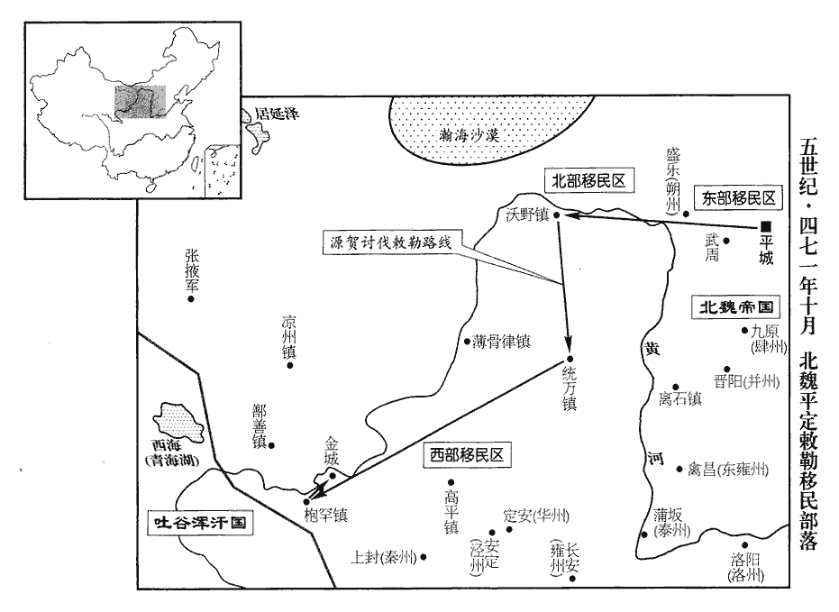 19冬,十月,魏沃野‹古朔方城,内蒙杭锦旗北黄河南岸›、統萬‹陕西靖边北白城子›二鎭敕勒叛,沃野,卽漢朔方郡沃野縣也;統萬,卽赫連故都,魏以爲鎭,置鎭將。陸恭之《風土記》:朔方故城,後魏改爲沃野鎭,去統萬八百餘里。遣太尉源賀帥衆討之;降二千餘落,帥,讀曰率。降,戶江翻。追擊餘黨至枹罕‹甘肃临夏›、金城‹甘肃兰州›,大破之,枹,音膚。斬首八千餘級,虜男女萬餘口,雜畜三萬餘頭。詔賀都督三道諸軍,屯于漠‹瀚海沙漠›南。