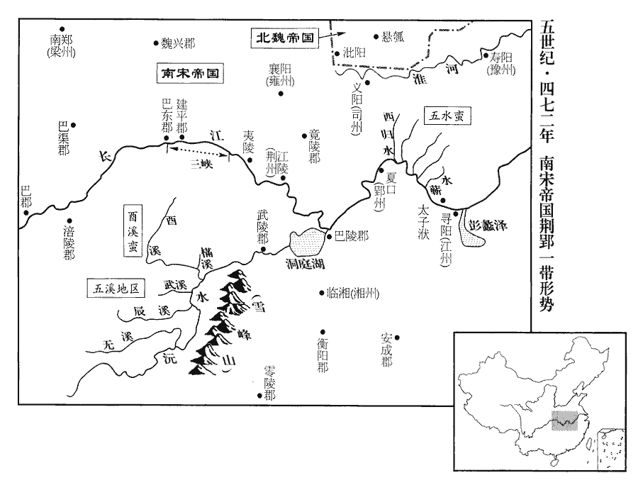 2大陽‹湖北蕲qí春›蠻酋桓誕擁沔水‹汉水›以北、滍‹沙河›•葉‹河南叶县西南›以南八萬餘落降於魏‹都平城,山西大同›,此卽五水蠻也。宋置大陽戍於蘄陽縣西。此縣卽漢江夏郡蘄春縣也。沔水以北,滍zhì、葉以南,皆羣蠻所居。誕擁以降魏,而誕實大陽蠻酋也。酋,慈由翻。沔,彌兗翻。滍,直里翻。葉,式涉翻。降,戶江翻。自云桓玄之子,亡匿蠻中,以智略爲羣蠻所宗。魏以誕為征南將軍、東荊州‹府沘阳,河南泌阳›刺史、襄陽王,東荊州治比陽縣。聽自選郡縣吏;使起部郎京兆‹西安›韋珍與誕安集新民,區置諸事,皆得其所。據《晉志》:武帝置起部郎。杜佑《通典》曰:晉、宋有起部而不常置。起部,工部也,取《虞書》「百工起哉」爲義。自是之後,諸蠻皆倚魏以侵擾南國。