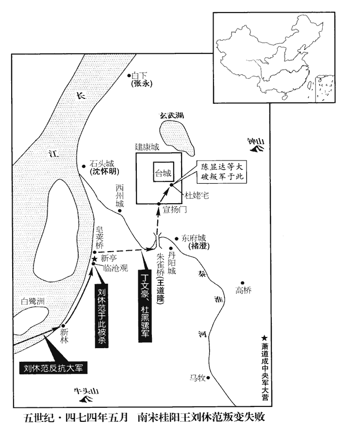 休範白服,乘肩輿,自登城南臨滄觀,臨滄觀在勞山上,江寧縣南十五里,亦曰勞勞亭。觀,古玩翻。以數十人自衛。《考異》曰:《張敬兒傳》云:「左右數百人皆散走。」按休範左右若有數百人,黃回、敬兒雖勇,何敢徑往取之!今從《休範傳》。屯騎校尉黃回與越騎校尉張敬兒謀詐降以取之。騎,奇寄翻。校,戶敎翻。降,戶江翻;下同。回謂敬兒曰:「卿可取之,我誓不殺諸王。」敬兒以白道成。道成曰:「卿能辦事,當以本州相賞。」敬兒,南陽冠軍‹河南邓州西北冠军寨›人。本州,謂雍州也。爲後敬兒求雍州張本。乃與回出城南,放仗走,大呼稱降。休範喜,召至輿側。回陽致道成密意,休範信之,以二子德宣、德嗣付道成爲質。呼,火故翻。質,音致。二子至,道成卽斬之。休範置回、敬兒於左右,所親李恆、鍾爽諫,不聽。恆,戶登翻。時休範日飲醇酒,回見休範無備,目敬兒;敬兒奪休範防身刀,斬休範首‹年二十五›,左右皆散走。敬兒馳馬持首歸新亭。