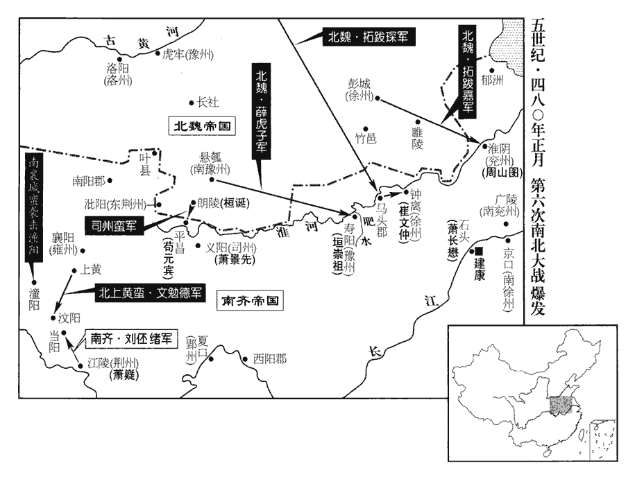 24上謂兗州刺史垣崇祖曰︰「吾新得天下,索虜必以納劉昶爲辭,侵犯邊鄙。南謂北爲索虜,以魏本索頭種也。索,昔各翻。壽陽‹安徽寿县›當虜之衝,非卿無以制此虜也。」乃徙崇祖爲豫州刺史。