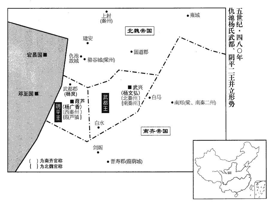 13氐王楊文弘卒,諸子皆幼,乃以兄子後起爲嗣。九月,辛酉‹十›,魏以後起爲武都王,文弘子集始爲白水太守。《五代史志》︰武都郡建威縣,魏置白水郡,唐貞觀初,省建威入將利縣。旣而集始自立爲王,後起擊破之。