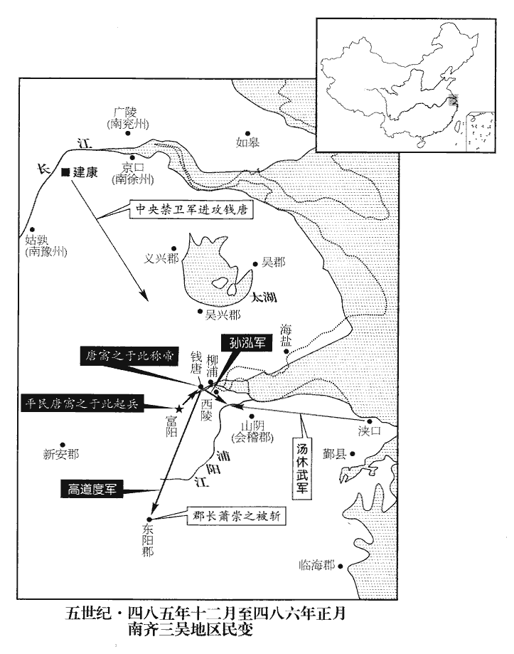 20初,太祖‹萧道成›命黃門郎虞玩之等檢定黃籍。見上卷太祖建元二年。上‹萧赜›卽位,別立校藉官,置令史,限人一日得數巧。巧,謂姦僞也。旣連年不已,民愁怨不安。外監會稽呂文度外監,屬中領軍。而親任過於領軍。會,工外翻。啓上,籍被卻者悉充遠戍,被,皮義翻。民多逃亡避罪。富陽‹浙江富阳›民唐㝢之因以妖術惑衆作亂,攻陷富陽,富陽,卽漢富春縣也,本屬會稽,後屬吳郡;晉簡文鄭太后諱春‹郑阿春›,孝武改曰富陽。妖,於驕翻。三吳卻籍者奔之,衆至三萬。