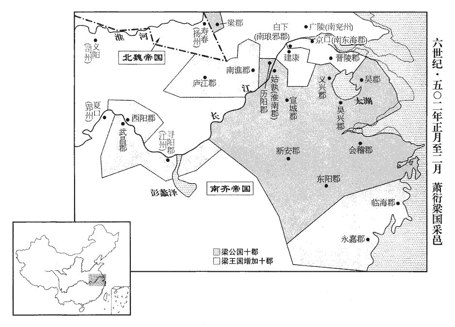 丙戌‹二十七›,詔梁公增封十郡,進爵為王。時以豫州之南譙‹安徽省巢湖市东南›。廬江‹安徽省舒城县›,江州之尋陽‹江西省九江市›,郢州之武昌‹湖北省鄂州市›、西陽‹湖北省黄州市›,南徐州之南琅邪‹白下·建康城北›、南東海‹京口·江苏省镇江市›、晉陵‹江苏省常州市›,揚州之臨海‹浙江省台州市西北章安镇›、永嘉‹浙江省温州市›十郡益梁國。癸巳‹五›,受命,赦國內及府州【章:十二行本「州」下有「所統」二字;乙十一行本同;孔本同;退齋校同。】殊死以下。自進爵為王已上,凡詔皆以宣德太后稱制行之。