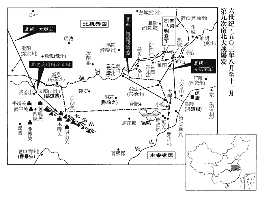 任城王澄命統軍党法宗、傅豎眼、太原王神念等分兵寇東關‹安徽省含山县西南›、大峴‹安徽含山县东北›、淮陵‹睢陵·安徽省明光市东北›、九山‹江苏省盱眙县西›,「淮陵」,恐當作「睢陵」。齊置徐州於鍾離,又僑置濟陰郡睢陵縣於郡界。五代志:鍾離郡化明縣,舊曰睢陵,置濟陰郡。化明,唐濠州之招義縣也。或曰:宋志,南徐州領淮陵郡,睢陵、淮陵皆屬漢徐部,是時既置徐州於鍾離,則亦置淮陵於鍾離界,未可知也。魏收志,陳留、鍾離二郡有朝歌縣,縣有九山城、黃溪水。按水經註,黃水出黃武山,東北流,逕南光城、弋陽等郡。今按今招信軍盱眙縣西南一十五里有三城,又西十五里至淮陵,城臨池河,池河過淮陵城西而北,入于淮,謂之池河口。九山店在淮北,南直淮陵。九山店之東則陷堈gāng湖,南則馬城。淮流至此,謂之九山灣。其東則鳳凰州,在淮水中,約長十里。今土人亦呼九山灣為獅子渡,北兵渡淮之津要也。峴,戶典翻。高祖珍將三千騎為遊軍,澄以大軍繼其後。豎眼,靈越之子也。傅靈越從薛安都起兵,攻張永以應義嘉,兵潰而死。豎,而主翻。魏人拔關要,潁川‹侨郡·安徽省含山县南›、大峴‹安徽含山县东北›三城,魏收志,霍州有北潁川郡,領潁川等三縣。水經註:梁立霍州,治灊縣天柱山。白塔、牽城、清溪皆潰。徐州‹府设钟离安徽省凤阳县东北临淮关›刺史司馬明素將兵三千救九山,將,即亮翻;下同。徐州長史潘伯鄰救淮陵。寧朔將軍王燮xiè保焦城,党法宗等進拔焦城,破淮陵,十一月,壬午‹四›,擒明素,斬伯鄰。