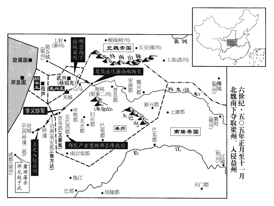 8魏邢巒至漢中‹陕西省汉中市›,擊諸城戍,所向摧破。晉壽‹四川省广元市西南›太守王景胤據石亭‹四川广元市北›,水經註:漢水自武興城北西南流,逕關城北,又西逕石亭戍,又逕晉壽城西。巒遣統軍李義珍擊走之。魏以巒為梁、秦二州‹府南郑›刺史。巴西‹北巴西郡·四川省阆中市›太守龐景民據郡不下,龐,皮江翻。郡民嚴玄思聚眾自稱巴州刺史,附於魏,攻景民,斬之。楊集起、集義聞魏克漢中而懼,閏月,帥群氐叛魏,斷漢中糧道,帥,讀曰率。斷,丁管翻。巒屢遣軍擊破之。