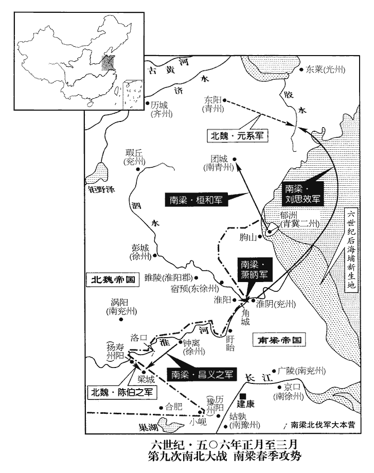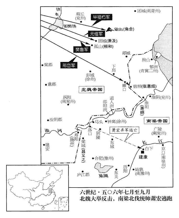 己丑‹二十六›,魏發定‹府设中山河北省定州市›、冀‹府设信都河北省冀县›、瀛‹府设赵都军城河北省河间市›、相‹府设邺城河北省临漳县西南邺镇›、并‹府设晋阳山西省太原市›、肆‹府设九原山西省忻州市›六州十萬人以益南行之兵。相,息亮翻。上遣將軍角念將兵一萬屯蒙山‹山东省蒙阴县南›,招納兗州之民,降者甚眾。魏收志,南青州東安郡新泰縣東南有蒙山。蓋蒙山即古所謂東蒙也,與固城、孤山皆近魏兗州東界,故梁連兵據之,以招兗州之民,北史邢巒傳,謂是時梁人侵軼徐、兗,是矣。角,姓也。姓苑,漢有角善叔。將,即亮翻。降,戶江翻。是時,將軍蕭及屯固城,桓和屯孤山‹滕州市东南›。魏收志,蘭陵郡蘭陵縣有石孤山,又昌慮縣有孤山。魏邢巒遣統軍樊魯攻和,別將元恆攻及,恆,戶登翻。統軍畢祖朽攻念。壬寅‹十›,魯大破和於孤山,恆拔固城,祖朽擊念,走之。