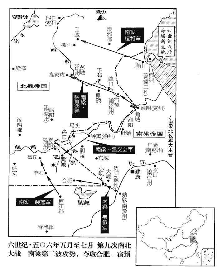 上‹萧衍›命景宗等豫裝高艦,使與魏橋等,為火攻之計,將,即亮翻。抄,楚交翻。艦,戶黯翻。令景宗與叡各攻一橋,叡攻其南,景宗攻其北。魏於邵陽洲兩岸立橋,南橋以接元英之兵,北橋以接楊大眼之兵。三月,淮水暴漲六七尺,考異曰:梁帝紀,「四月,癸未,景宗等破魏軍。」魏帝紀,「四月,戊戌,鍾離大水,英敗績。」按曹景宗傳云,「三月,春水生,淮水暴漲。」梁魏二史蓋據奏到月日書之耳,今從景宗傳。叡使馮道根與廬江‹安徽省舒城县›太守裴邃、秦郡‹侨郡·江苏省六合县›太守李文釗等沈約曰:晉武帝分扶風為秦國,中原亂,其民南流,寄居堂邑。堂邑本為縣,前漢屬臨淮,後漢屬廣陵,晉又屬臨淮。惠帝永興元年,以臨淮淮陵立堂邑郡,安帝改堂邑為秦郡。五代志,揚州六合縣,舊曰尉氏,置秦郡。乘鬬艦競發,擊魏洲上軍盡殪。殪yì,於計翻。別以小船載草,灌之以膏,從而焚其橋,風怒火盛,烟塵晦冥,敢死之士,拔柵斫橋,水又漂疾,倏忽之間,橋柵俱盡。道根等皆身自搏戰,軍人奮勇,呼聲動天地,呼,火故翻。無不一當百,魏軍大潰。英見橋絕,脫身棄城走,大眼亦燒營去。諸壘相次土崩,悉棄其器甲,爭投水死者十餘萬,斬首亦如之。叡遣報昌義之,義之悲喜,不暇答語,但叫曰:「更生,更生!」諸軍逐北至濊huì水‹于安徽省五河县注入淮河›上,魏收志,睢州穀陽郡連城縣有濊水。按水經註,服虔云:穀水在沛國相縣界。蓋睢水逕穀熟而兩分,穀水之名蓋因地變,然則穀水即泗水也。魏收又云:睢州即梁之潼州,治取慮城。又按水經註,睢水自穀熟東流,逕取慮城北,又東逕睢陵城北,又東與潼水會。參而考之,則濊水當在沛、臨淮二郡界。丁度集韻曰:濊,呼外翻,一作「渙」,音同,水名,在亳州。是則濊水即渙水,音同而字異耳。英單騎入梁城,緣淮百餘里,尸相枕藉,生擒五萬人,枕,之任翻。藉,慈夜翻。考異曰:韋叡傳云:「其餘釋甲稽顙,乞為囚奴者,猶數十萬。」按魏軍共止數十萬,如叡傳所言,似為太過。今從景宗傳。收其資糧、器械山積,牛馬驢騾不可勝計。騾,盧戈翻。勝,音升。