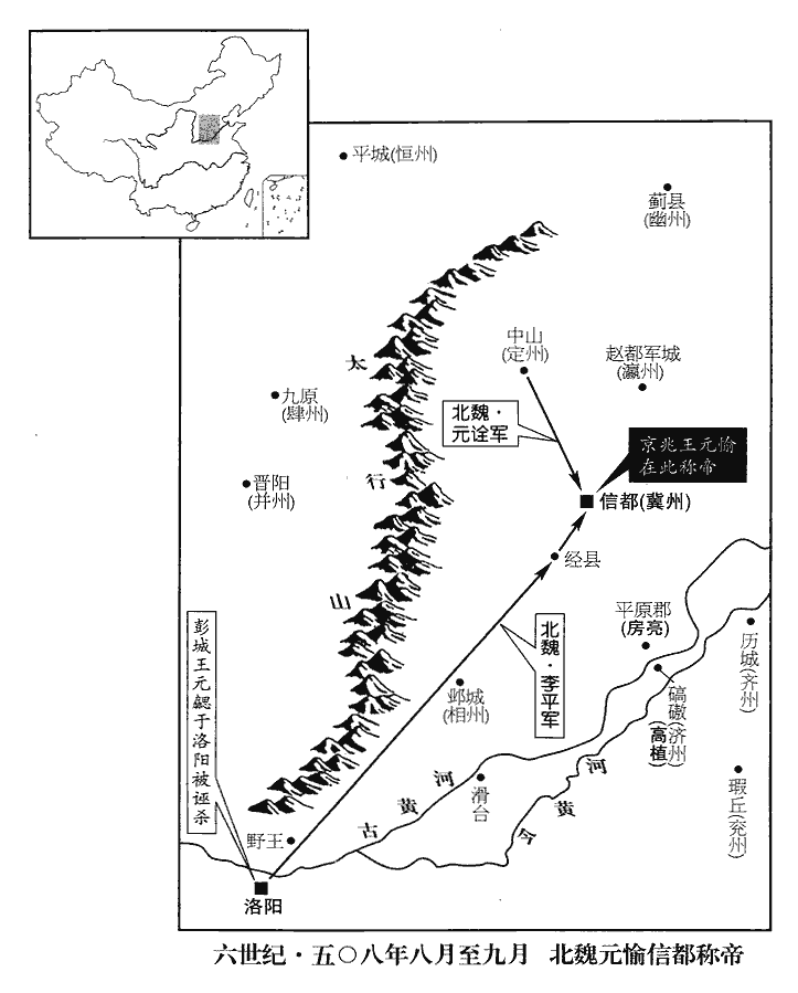 13魏京兆王愉遣使說平原‹山东省聊城市›太守清河‹山东省临清市›房亮,亮斬其使;愉遣其将張靈和擊之,為亮所敗。說,式芮翻。將,即亮翻。敗,補邁翻。李平軍至經縣‹河北省广宗县东北›,經縣,漢、晉屬安平國,魏收志屬鉅鹿郡。諸軍大集,夜,有蠻兵數千斫平營,矢及平帳,平堅臥不動,俄而自定。蠻兵蓋亦李平所統,欲為內變,而平不動,故自定。九月,辛巳朔‹一›,愉逆戰於城南草橋,平奮擊,大破之,愉脫身走入城‹信都,河北省冀县›,平進圍之。壬辰‹十二›,安樂王詮破愉兵於城北。