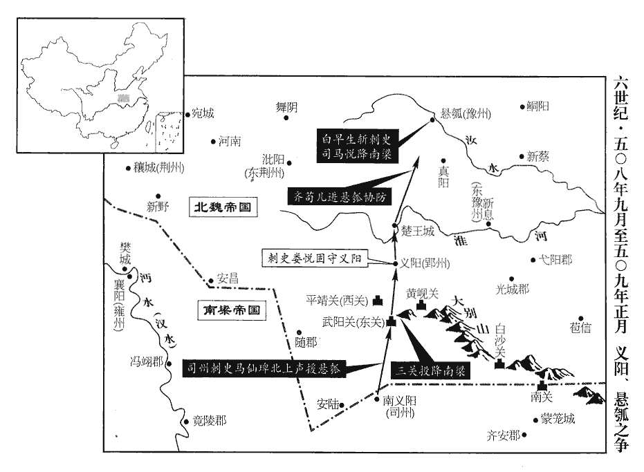 16庚子‹二十›,魏郢州‹府设义阳›司馬彭珍等叛魏,潛引梁兵趨義陽,三關‹义阳南›戍主侯登等以城來降。郢州刺史婁悅嬰城自守,魏以中山王英都督南征諸軍事,將步騎三萬,出汝南‹悬瓠·河南省汝南县›以救之。趨,七喻翻。降,戶江翻。將,即亮翻。騎,奇寄翻。考異曰:田益宗傳,詔曰:「英統馬步七萬,邢巒統精騎三萬,」蓋虛聲耳。今從魏帝紀。