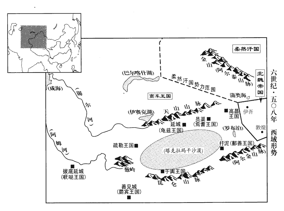 初,高車‹新疆天山›山脉北麓侯倍窮奇為嚈yàn噠‹首都拔底延城阿富汗北部瓦齐拉巴德市›所殺,嚈噠國,大月氏之種類也,亦曰高車之別種,其原出於塞北,自金山而南,在于闐之西,去長安一萬一百里;其王都拔底城,蓋王舍城也。嚈,益涉翻。噠,當割翻,又陁tuó葛翻,又宅軋翻。執其子彌俄突而去,其眾分散,或奔魏,或奔柔然。魏主遣羽林監河南孟威撫納降戶,置於高平鎮‹宁夏固原县›。降,戶江翻。高車王阿伏至羅殘暴,國人殺之,立其宗人跋利延。嚈噠奉彌俄突以伐高車,國人殺跋利延,迎彌俄突而立之。彌俄突與佗汗可汗戰于蒲類海‹新疆巴里坤县西北巴里坤湖›,不勝,西走三百餘里。佗汗軍於伊吾‹新疆哈密市›北山。會高昌‹新疆吐鲁番市东›王麴嘉求內徙於魏,時孟威為龍驤將軍,驤,思將翻。魏主遣威發涼州‹府设姑臧甘肃省武威市›兵三千人迎之,至伊吾,佗汗見威軍,怖而遁去。怖,普布翻。彌俄突聞其離駭,追擊,大破之,殺佗汗於蒲類海北,割其髮送於威,且遣使入貢於魏。使,疏吏翻。魏主使東城子于亮報之,賜遺甚厚。遺,于季翻。高昌王嘉失期不至,威引兵還。