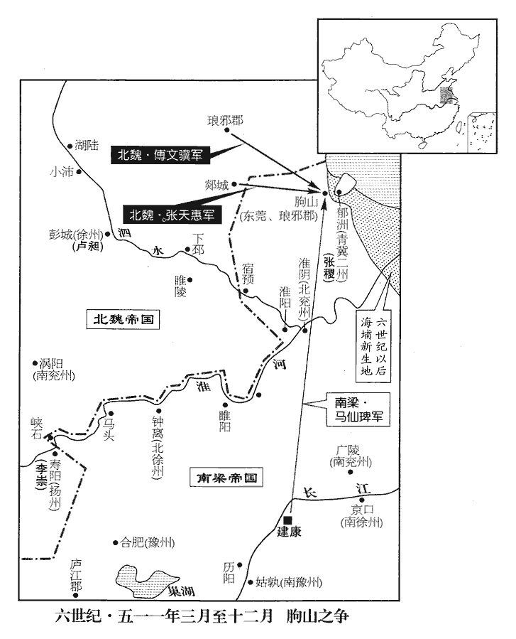 7魏徐州‹府设彭城江苏省徐州市›刺史盧昶遣郯城‹山东省郯城县›戍副張天惠、秦置郯郡,漢改為東海郡,魏復置郯郡,屬東徐州。郯,音談。琅邪‹山东省临沂市›戍主傅文驥相繼赴朐山,青、冀二州刺史張稷遣兵拒之,不勝。梁青、冀二州治鬱洲。夏,四月,文驥等據朐山,詔振遠將軍馬仙琕擊之。琕,部田翻。魏又遣假安南將軍蕭寶寅、假平東將軍天水‹甘肃省天水市›趙遐將兵據朐山,受盧昶節度。將,即亮翻。