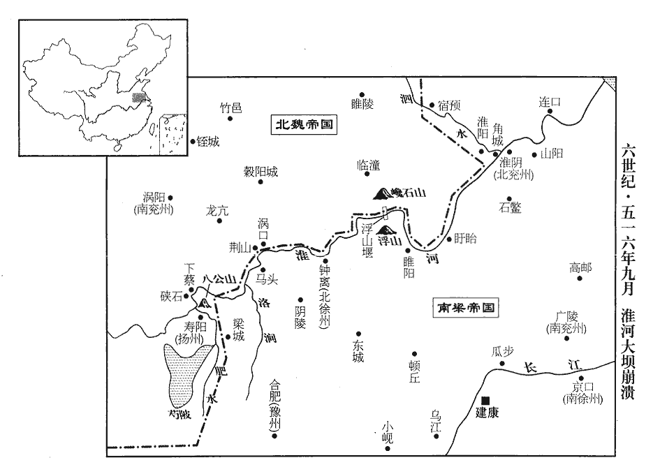 9夏,四月,浮山堰‹淮河大坝·安徽省明光市北›成而復潰,或言蛟龍能乘風雨破堰,其性惡鐵,復,扶又翻。惡,烏路翻。乃運東、西冶鐵器數千萬斤沈之,建康有東、西二冶,各置冶令以掌之。沈,持林翻。亦不能合。乃伐樹為井幹,井幹,井欄也。言疊木為井幹之形。幹,揚子註及西都賦註音寒,莊子音如字。填以巨石,加土其上;緣淮百里內木石無巨細皆盡,負檐者肩上皆穿,夏日疾疫,死者相枕,檐,都濫翻。枕,職任翻。蠅蟲晝夜聲合。