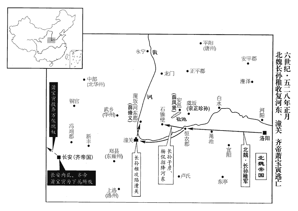 4蕭寶寅圍馮翊‹陕西省高陵县›,未下;長孫稚軍至恆農‹河南省三门峡市›,長,知兩翻。恆,戶登翻。行臺左丞楊侃謂稚曰:「昔魏武與韓遂、馬超據潼關‹陕西省潼关县›相拒,遂、超之才,非魏武敵也,然而勝負久不決者,扼其險要故也。事見六十六卷漢獻帝建安十六年。今賊守禦已固,雖魏武復生,無以施其智勇。復,扶又翻。不如北取蒲反‹山西省永济县›,此用前漢書地理志「蒲反」字。渡河而西,入其腹心,此亦魏武之故智也。置兵死地;則華州‹府设武乡陕西省大荔县›之圍不戰自解,五代志:馮翊郡,後魏置華州。華,戶化翻。潼關之守必內顧而走,支節既解,長安‹西安›可坐取也。若愚計可取,願為明公前驅。」稚曰:「子之計則善矣;然今薛脩義圍河東‹蒲坂·山西省永济县›,薛鳳賢據安邑‹山西省运城市›,宗正珍孫守虞坂‹山西省平陆县北二十千米中条山口›不得進,水經註曰:虞坂,即左傳所謂顛軨líng,在傅巖東北十餘里,東西絕澗,於中築以成道,指南北之路,謂之軨橋。橋之東北有虞原,上道東有虞城,其城北對長坂二十餘里,謂之虞坂。戰國策曰:「昔騏驥駕鹽車上虞坂,遷延不能進。」正此處也。坂,音反。如何可往?」侃曰:「珍孫行陳一夫,行,戶剛翻。陳,讀曰陣。因緣為將,將,即亮翻。可為人使,安能使人!河東治在蒲反,治,謂治所也。西逼河漘,漘chún,船倫翻,水厓也。上平坦而下水深曰漘。封疆多在郡東。脩義驅帥士民西圍郡城,其父母妻子皆留舊村,一旦聞官軍來至,皆有內顧之心,必望風自潰矣。」稚乃使其子子彥與侃帥騎兵自恆農北渡,據石錐壁‹山西省运城市西南›,五代志,河東郡虞鄉縣有石錐山,於此築壘壁也。侃聲言:「今且停此以待步兵,且觀民情向背。命送降名者各自還村,俟臺軍舉三烽,當亦舉烽相應;其無應烽者,乃賊黨也,當進擊屠之,以所獲賞軍。」於是村民轉相告語,背,蒲妹翻。語,牛倨翻。降,戶江翻;下同。雖實未降者亦詐舉烽,一宿之間,火光遍數百里,賊圍城者不測其故,各自散歸;脩義亦逃還,與鳳賢俱請降。丙子‹十八›,稚克潼關,遂入河東。
