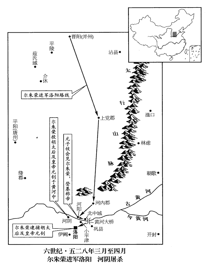 鄭先護素與敬宗善,聞帝即位,與鄭季明開城納之。李神軌至河橋,聞北中不守,晉杜預建河橋於富平津。河北側岸有二城相對,魏高祖置北中郎府,徙諸從隸府戶并羽林虎賁領隊防之。北中不守,可以平行至洛陽矣。宋白曰:北中城,即今河陽城。即遁還;費穆棄眾先降於榮。降,戶江翻。徐紇矯詔夜開殿門,取驊騮廄御馬十匹,驊騮,駿馬也,故魏以名御馬廄。東奔兗州‹府设瑕丘山东省兖州市›,將依羊侃也。為侃與紇南歸張本。鄭儼亦走還鄉里‹河南省开封市西南›。鄭儼,滎陽開封人。太后盡召肅宗‹元诩›後宮,皆令出家,太后亦自落髮。榮召百官迎車駕,己亥‹十二›,百官奉璽綬,備法駕,迎敬宗‹元子攸›於河橋。璽,斯氏翻。綬,音受。考異曰:伽藍記云:「十二日,爾朱榮軍于邙山之北,河陰之野。十三日,召百官迎駕,至者盡誅之。」長曆,是月戊子朔;十二日,己亥也。今從魏書。庚子‹十三›,榮遣騎執太后及幼主‹元钊,三岁›,送至河陰‹河南省孟津县西北›。騎,奇寄翻。太后對榮多所陳說,榮拂衣而起,沈太后及幼主於河。