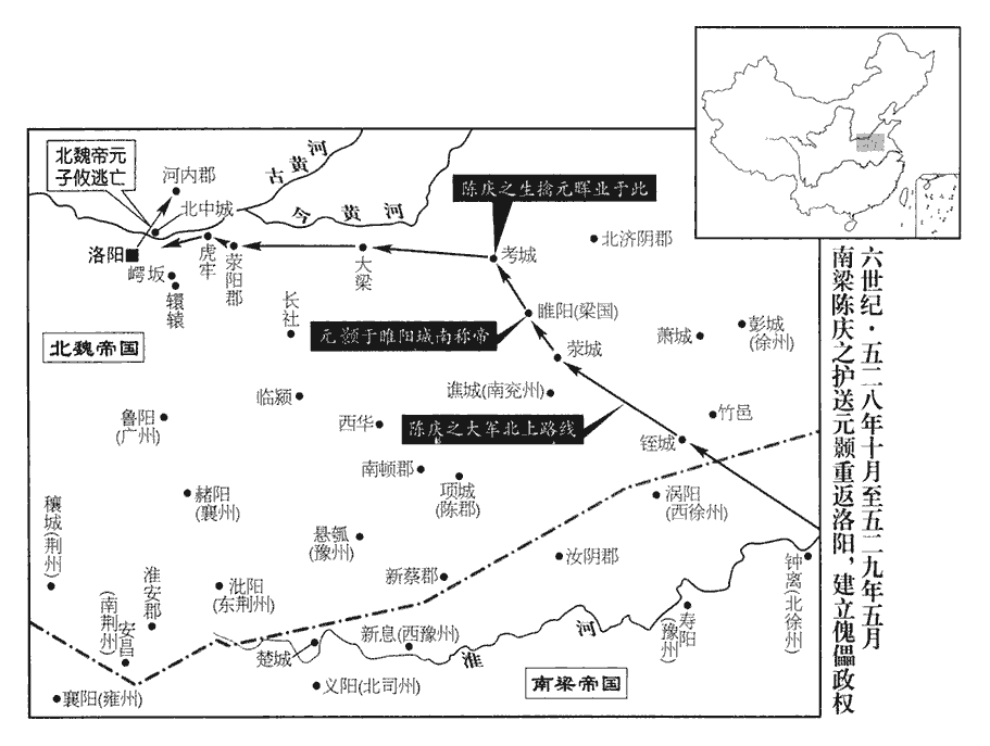 顥與陳慶之乘虛自銍城‹安徽省宿州市西南›進拔滎城‹河南省虞城县西南›,遂至梁國;水經註,春秋沙隨之地。杜預註以為即梁國寧陵縣北之沙陽亭,俗謂之堂城,「滎」「堂」字相近,意即此地而字訛也。銍,陟栗翻。魏丘大千有眾七萬,分築九城以拒之。慶之攻之,自旦至申,拔其三壘,大千請降。降,戶江翻;下同。顥登壇燔燎,即帝位於睢陽城南,改元孝基。睢,音雖。考異曰:魏帝紀,去年十月蕭衍以顥為魏主,號年孝基,入據銍城。顥傳,「永安二年四月於梁國城南登壇燔燎,年號孝基。」今從之。濟陰王暉業帥羽林兵二萬軍考城‹河南省民权县东›,前漢梁國有甾縣,後漢章帝更名考城,屬陳留郡,晉省,宋屬濟陽郡。五代志曰:梁郡考城縣,後魏曰考陽,置北梁郡,隋復為考城縣,屬宋州。帥,讀曰率。慶之攻拔其城,擒暉業。考異曰:魏書帝紀,克考城在辛丑後,今從梁帝紀。