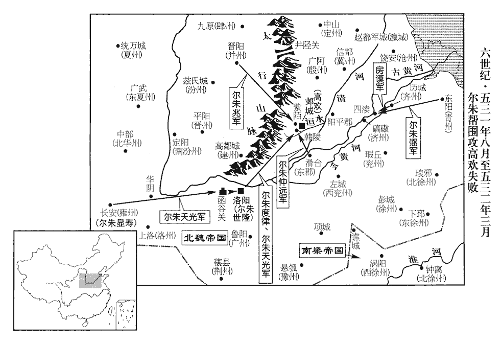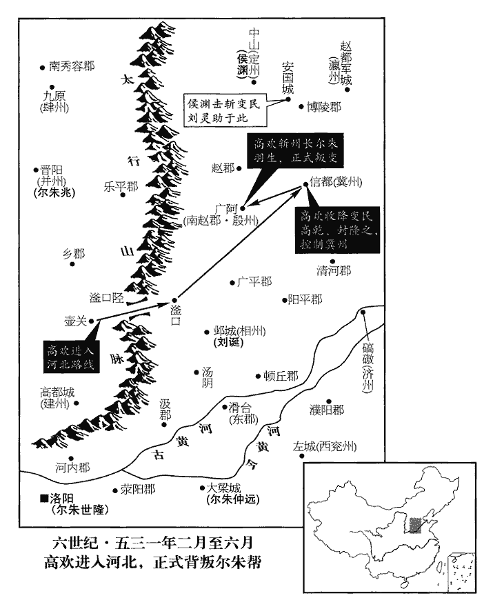 11壬寅‹十›,魏丞相歡引兵入滏口‹河北省武安市南›,大都督庫狄干入井陘‹河北省井陉县东北›,擊爾朱兆。滏,音父。陘,音刑。庚戌‹十八›,魏主使驃騎大將軍、儀同三司高隆之帥步騎十萬會丞相歡于太原,因以隆之為丞相軍司。歡軍於武鄉‹山西省榆社县›,晉置武鄉縣,屬上黨郡,石勒分置武鄉郡,唐為武鄉縣,屬潞州,我朝屬威勝軍。爾朱兆大掠晉陽,北走秀容‹北秀容·山西省朔州市西北›。并州平。走,音奏。歡以晉陽四塞,太原郡之地,東阻太行、常山,西有蒙山,南有霍太山、高壁嶺,北阨東陘、西陘關,故亦以為四塞之地。乃建大丞相府而居之。自此至于高齊建國,遂以晉陽為陪都。