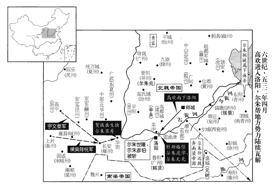 斛斯椿陰謂賀拔勝曰:「天下皆怨毒爾朱,而吾等為之用,亡無日矣,不如圖之。」勝曰:「天光與兆各據一方,欲盡去之甚難,去之不盡,必為後患,柰何?」椿曰:「此易致耳。」乃說世隆追天光等赴洛,共討高歡。復,扶又翻。去,羌呂翻。說,式芮翻。世隆屢徵天光,天光不至,使椿自往邀之,曰:「高歡作亂,非王不能定,豈可坐視宗族夷滅邪!」天光不得已,將東出,問策於雍州‹府设长安陕西省西安市›刺史賀拔岳,賀拔岳自岐州遷刺雍州。雍,於用翻。岳曰:「王家跨據三方,兆北據并、汾‹山西省中部›,天光西奄關、隴‹函谷关以西›,仲遠擅命徐、兗‹山东省西部及江苏省北部›,是跨據三方。士馬殷盛,高歡烏合之眾,豈能為敵!但能同心戮力,往無不捷。若骨肉相疑,則圖存之不暇,安能制人!如下官所見,莫若且鎮關中以固根本,分遣銳師與眾軍合勢,進可以克敵,退可以自全。」天光不從。閏月,壬寅‹八›,天光自長安,兆自晉陽‹山西省太原市›,度律自洛陽,仲遠自東郡‹河南省滑县›皆會於鄴,眾號二十萬,夾洹水‹清河支流,流经河南省安阳市境›而軍,水經註:洹水逕鄴城南。洹huán,于元翻。節閔帝‹元恭›以長孫稚為大行臺,總督之。