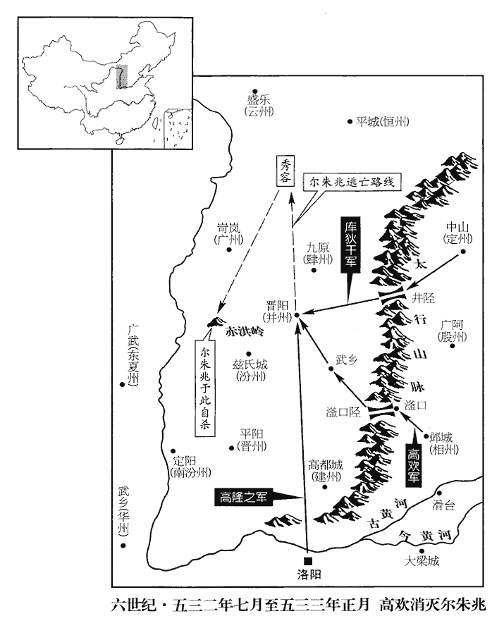 2魏竇泰奄至爾朱兆庭,軍人因宴休惰,忽見泰軍,驚走,追破之於赤谼嶺‹山西省离石县东北›,杜佑曰:石州離石縣有赤洪水,即離石水,赤洪其別名也。高歡破爾朱兆於赤洪嶺,蓋近此。又曰:赤洪水源出方山縣,東流入離石。谼hóng,戶工翻。考異曰:魏帝紀:正月,庚寅朔;甲午,齊獻武王自晉陽出討兆,丁酉,大破之於赤洪嶺。北齊帝紀:出兵在去年,破兆在今年。按歲首宴會,不應直至八日。今從齊書。眾並降散。降,戶江翻;下同。兆逃於窮山,命左右西河‹山西省汾阳县›張亮及蒼頭陳山提斬己首以降,皆不忍;兆乃殺所乘白馬,自縊於樹。歡親臨,厚葬之。縊,於賜翻,又於計翻。臨,力鴆翻,哭也。慕容紹宗攜爾朱榮妻子及兆餘眾詣歡降,歡以義故,待之甚厚。義故,猶言義舊也。兆之在秀容‹北秀容·山西省朔州市西北›,左右皆密通款於歡,唯張亮無啟疏,疏,所故翻。歡嘉之,以為丞相府參軍。