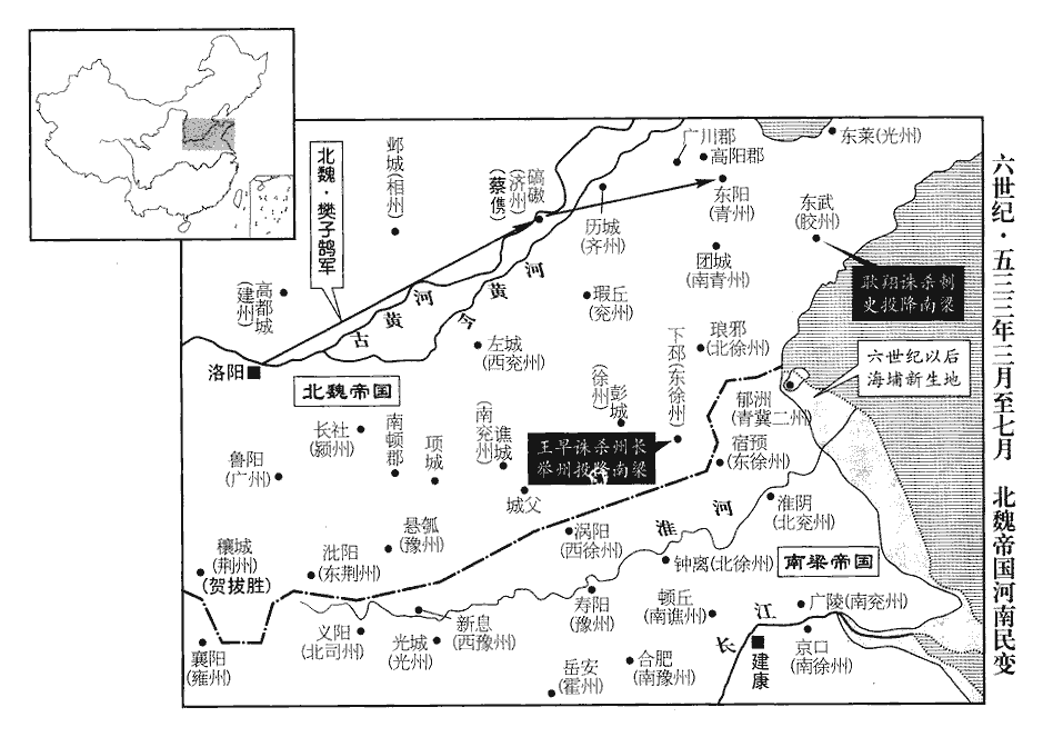 23魏荊州刺史賀拔勝寇雍州‹府设襄阳湖北省襄樊市›,此梁之雍州,治襄陽。拔下迮戍‹襄阳城北›,迮zé,側百翻,亦作「莋」。扇動諸蠻;雍州刺史廬陵王續遣軍擊之,屢為所敗,敗,補賣翻。漢南震駭。勝又遣軍攻馮翊‹侨郡·湖北省宜城县西南›、安定‹侨郡·湖北省南漳县›、沔陽‹湖北省仙桃市西南›、酇城‹湖北省老河口市西北›,皆拔之。五代志:竟陵郡藍水縣僑立馮翊郡。沔陽郡後為復州。襄陽郡陰城縣,舊置酇城郡。蕭子顯齊志:寧蠻府所領郡有安定郡,領新安等縣。五代志,新安縣并入襄陽郡南漳縣,當是置安定僑郡於南漳界也。藍水,唐并入郢州長壽縣;陰城,并入穀城縣。沈約志:馮翊郡治襄陽郡鄀ruò縣。沔,彌兗翻。酇,音贊。續遣電威將軍柳仲禮屯穀城‹湖北省谷城县›以拒之,五代志:穀城縣,屬襄陽郡,舊曰義城,置義城郡。勝攻之,不克,乃還;於是沔北盪為丘墟矣。盪,徒朗翻。仲禮,慶遠之孫也。柳慶遠見一百四十三卷齊東昏侯永元二年。