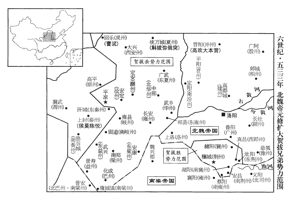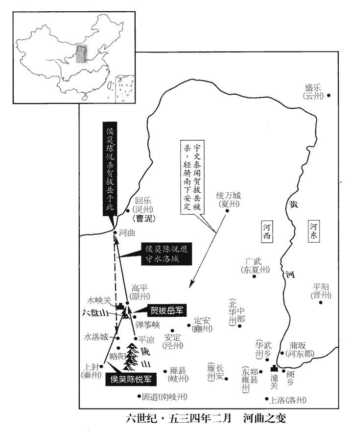 6魏賀拔岳將討曹泥‹时驻灵州,州政府设回乐宁夏灵武县›,使都督武川‹内蒙古武川县›趙貴至夏州‹府设统万陕西省靖边县北白城子›與宇文泰謀之,泰曰:「曹泥孤城阻遠,未足為憂。侯莫陳悅貪而無信,宜先圖之。」岳不聽,曹泥附高歡,岳不從宇文泰之言,急於致討,蓋欲報高歡禽伊利之役耳,亦忿兵也。召悅會於高平‹宁夏固原县›,與共討泥。悅既得翟嵩之言,乃謀取岳。岳數與悅宴語,數,所角翻。長史武川雷紹諫,不聽。岳使悅前行,至河曲‹宁夏中宁县东北,黄河弯曲处›,河曲在靈州西。河千里一曲。河水自澆河至漢眴卷古縣,率東北流,至富平始曲而北流,所謂河曲也。富平,唐靈州地。悅誘岳入營坐,論軍事,誘,音酉。悅陽稱腹痛而起,其壻元洪景拔刀斬岳。岳左右皆散走,悅遣人諭之云:「我別受旨,止取一人,諸君勿怖。」怖,普布翻。眾以為然,皆不敢動。而悅心猶豫,不即撫納,乃還入隴,屯水洛城‹甘肃省庄浪县›。我朝以渭州籠竿城置德順軍;水洛城在軍西一百里。岳眾散還平涼‹甘肃省华亭县›,趙貴詣悅請岳尸葬之,悅許之。岳既死,悅軍中皆相賀,行臺郎中薛憕私謂所親曰:「悅才略素寡,輒害良將,吾屬今為人虜矣,何賀之有!」憕,真度之從孫也。憕zhèng,直陵翻。將,即亮翻。薛真度見一百三十九卷齊明帝建武元年。