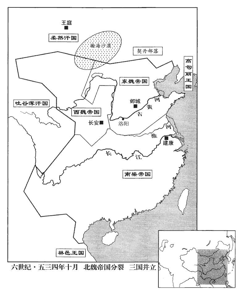 魏主問計於群臣,或欲奔梁,或云南依賀拔勝,或云西就關中,或云守洛口‹洛水注入黄河处·河南省巩县东北›死戰,洛水過鞏縣東而北入于河,謂之洛口。計未決。元斌之與斛斯椿爭權,棄椿還,紿帝云:「高歡兵已至!」考異曰:魏書斛斯椿傳云:「椿懼己不免,復啟出帝,假說遊聲以劫脅帝,帝信之,遂入關。」按齊高祖舉兵向洛,而云椿劫脅帝,不亦誣乎!此乃魏收欲媚齊人,重椿之罪耳。今從齊書高祖紀及北史椿傳。丁未‹二十七›,帝遣使召椿還,遂帥南陽王寶炬、清河王亶、廣陽王湛以五千騎宿於瀍‹瀍水,洛水支流›西,南陽王別舍沙門惠臻負璽持千牛刀以從。帥,讀曰率。璽,斯氏翻。從,才用翻。眾知帝將西出,其夜,亡者過半,亶、湛亦逃歸。湛,深之子也。廣陽王深為葛榮所殺。武衛將軍雲中‹内蒙古托克托县›獨孤信單騎追帝,令狐德棻曰:獨孤部與魏俱起,三十六大姓之一也。帝歎曰:「將軍辭父母,捐妻子而來,『世亂識忠臣,』豈虛言也!」戊申‹二十八›,帝西奔長安,李賢遇帝于崤中。陝有三崤之山。魏太和十一年置崤縣,屬恆農郡。己酉‹二十九›,歡入洛陽,舍於於永寧寺,遣領軍婁昭等追帝,請帝東還。長孫子彥不能守陝,棄城走。高敖曹帥勁騎追帝至陝西,不及。陝西,陝城之西也。帝鞭馬長騖,糗漿乏絕,騖,音務。糗qiǔ,去久翻,熬米麥為之。鄭玄曰:漿,酢酨zài,周官漿人掌之。三二日間,從官唯飲澗水。從,才用翻。至湖城‹河南省灵宝县西,西汉戾太子刘据被杀处›,有王思村民以麥飯壺漿獻帝,帝悅,復一村十年。至稠桑‹灵宝县西北湖城西›,湖城,即漢湖縣城。湖城西有稠桑驛。復,方目翻。潼關‹陕西省潼关县›大都督毛鴻賓迎獻酒食,從官始解飢渴。