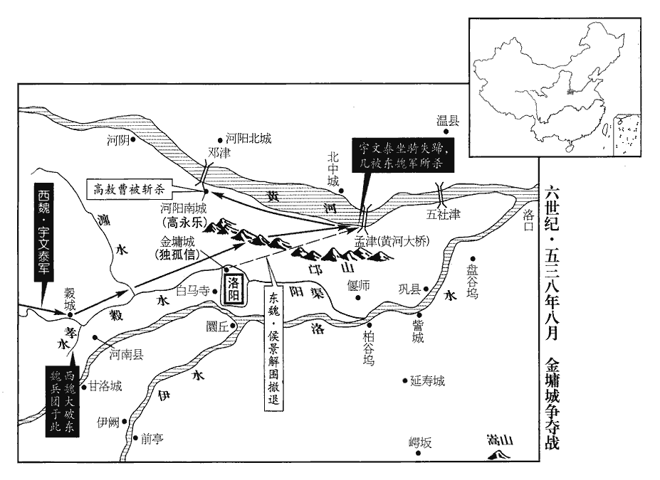 13東魏太師歡自晉陽將七千騎至孟津‹河南省孟津县东黄河渡口›,未濟,聞魏師已遁,遂濟河,遣別將追魏師至崤xiáo,魏收志:太和十一年,置崤縣,屬恆農郡,因三崤山以名縣;隋并崤縣入河南熊耳縣。程大昌曰:三崤山,一名嶔qīn崟yín山。元和志曰:自東崤至西崤三十五里。東崤長阪數里,峻阜絕澗,車不得方軌。西崤全是石阪十二里,險不異東崤。此二崤皆在秦關之東,漢關之西。不及而還。還,從宣翻,又如字;下同。歡攻金墉,長孫子彥棄城走,焚城中室屋俱盡,歡毀金墉而還。