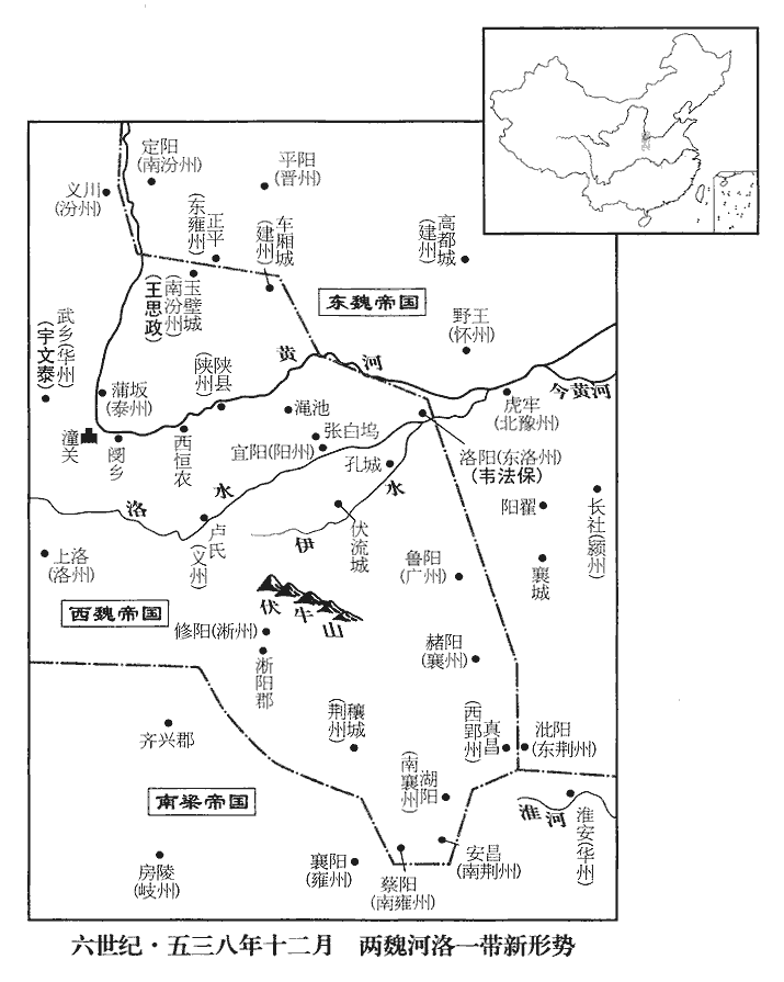 19初,魏伊川‹伊水,流经河南省嵩县,于洛阳市东注入洛水›土豪李長壽為防蠻都督,五代志:河南郡陸渾縣,齊置伊川郡,領南陸渾縣。春秋時秦、晉遷陸渾之戎於伊川,故郡以為名。伊闕以南大山長谷,蠻多居之,魏置都督以防焉。積功至北華州‹府设中部陕西省黄陵县›刺史。孝武帝西遷,長壽帥其徒拒東魏,華,戶化翻。帥,讀曰率。魏以長壽為廣州刺史。侯景攻拔其壁,殺之。其子延孫復收集父兵以拒東魏,魏之貴臣廣陵王欣、錄尚書長孫稚等皆攜家往依之,長,知兩翻。延孫資遣衛送,使達關中。東魏高歡患之,數遣兵攻延孫,不能克。數,所角翻。魏以延孫為京南行臺、節度河南諸軍事、廣州刺史。京南,謂洛京以南也。延孫以澄清伊、洛為己任,魏以延孫兵少,少,詩沼翻。更以長壽之壻京兆韋法保為東洛州刺史,西魏洛州治上洛,以洛陽之地為東洛州。配兵數百以助之。法保名祐,以字行,既至,與延孫連兵置柵於伏流‹河南省嵩县›。伏流城,伊川郡治所。隋改南陸渾縣曰伏流。水經註曰:陸渾故城東南八十許里有三塗山,伊水逕其下,又東北逕伏流嶺東,劉澄之永初記稱伏流縣西有伏流坂者。今山在縣南崖口北三十里許,西則非也。獨孤信之入洛陽也,欲繕脩宮室,使外兵郎中天水‹甘肃省天水市›權景宣,曹魏置二十三郎,有中兵、外兵、都兵、別兵,元魏以後,中兵、外兵又分左、右。帥徒兵三千出採運。採運者,使之採木運入洛陽城也。會東魏兵至,河南皆叛,景宣間道西走,間,古莧翻。與李延孫相會,攻孔城‹河南省伊川县西南›,拔之,魏收志:天平中置新城郡,治孔城,屬北荊州。五代志:河南郡伊闕縣,舊曰新城,置新城郡。杜佑曰:孔城防,今伊闕縣東南故城是。又曰:高齊置孔城防於壽安縣。洛陽以南尋亦西附。丞相泰即留景宣守張白塢‹河南省宜阳县西北›,塢在宜陽西北。水經註:河內軹縣有張白騎塢,在湨jú水北原上,據二溪之會,北帶深隍,三面阻險,唯西面板築而已。節度東南諸軍應關西者。是歲,延孫為其長史楊伯蘭所殺,韋法保即引兵據延孫之柵。