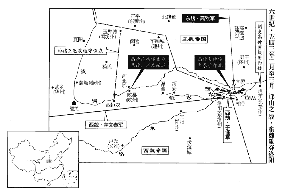 歡進至陝‹河南省三门峡›,陝,失冉翻。泰遣開府儀同三司達奚武等拒之。行臺郎中封子繪言於歡曰:「混壹東西,正在今日。昔魏太祖‹曹操›平漢中‹陕西省汉中市›,不乘勝取巴、蜀,事見六十七卷漢獻帝建安二十年。失在遲疑,後悔無及。願大王不以為疑。」歡深然之,集諸將議進止,咸以為「野無青草,人馬疲瘦,不可遠追。」陳元康曰:「兩雄交爭,歲月已久。今幸而大捷,天授我也,時不可失,當乘勝追之。」歡曰:「若遇伏兵,孤何以濟?」元康曰:「王前沙苑失利,彼尚無伏;今奔敗若此,何能遠謀!若捨而不追,必成後患。」歡不從,為歡悔不用陳元康之言張本。余謂邙山之戰,蓋俱傷而兩敗,宇文泰雖力屈而遁,高歡之氣亦衰矣,安敢復深入乎!使劉豐生將數千騎追泰,遂東歸。