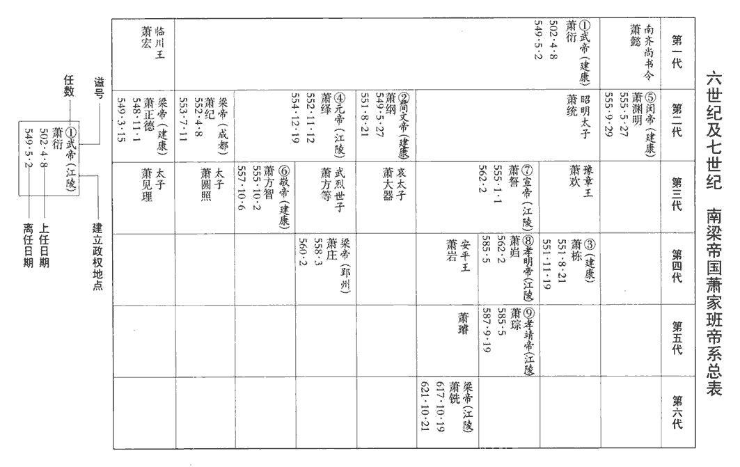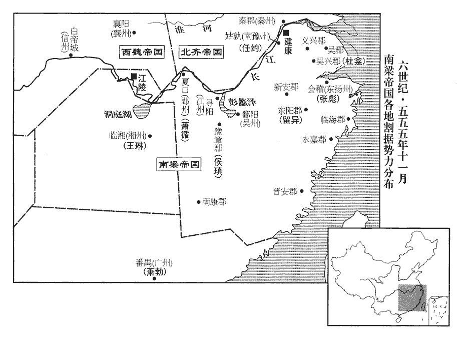 2梁王詧‹本年三十七岁›即皇帝位於江陵,詧,字理孫,梁昭明太子之第三子也。考異曰:周書詧傳云:「詧在位八載,保定二年薨。」然則詧雖以甲戌年為魏所立,乙亥年乃即位改元也。改元大定;追尊昭明太子‹萧统›為昭明皇帝,廟號高宗,妃蔡氏為昭德皇后;尊其母龔氏為皇太后,立妻王氏為皇后,子巋為皇太子‹本年十四岁›。巋kuī,區韋翻,又苦鬼翻,又丘愧翻。賞刑制度並同王者,唯上疏於魏‹首都长安陕西省西安市›則稱臣,奉其正朔。上,時掌翻。至於官爵其下,亦依梁氏之舊,其勳級則兼用柱國等名。勳級,置以賞功。柱國,魏所置也,為勳級之首。以諮議參軍蔡大寶為侍中、尚書令,參掌選事。選,須絹翻。外兵參軍太原王操為五兵尚書。大寶嚴整有智謀,雅達政事,雅,素也。文辭贍速,後梁主‹萧詧›推心任之,以為謀主,比之諸葛孔明;操亦亞之。追贈邵陵王綸太宰,諡曰壯武;邵陵王綸死於大寶二年。河東王譽丞相,諡曰武桓。河東王譽死於大寶元年。以莫勇為武州‹府设武陵湖南省常德市›刺史,魏永壽為巴州‹府设巴陵湖南省岳阳市›刺史,武州、巴州皆置於江陵之南岸,二將尋為侯平所擒,不能有二州也。