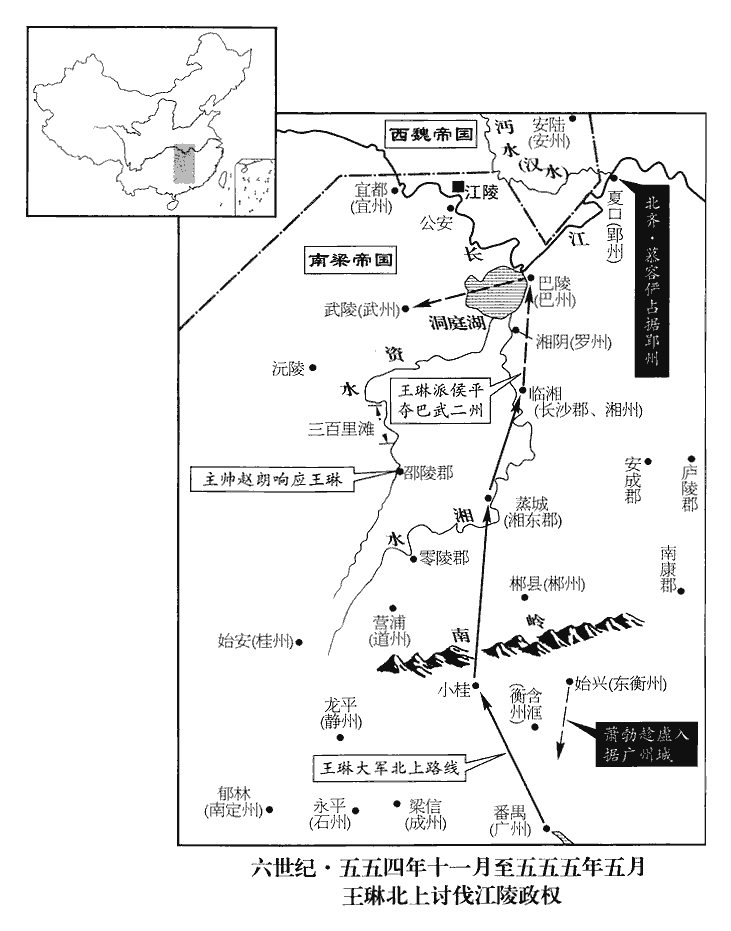 3湘州‹府设临湘湖南省长沙市›刺史王琳將兵自小桂‹广东省连州市›北下,據姚思廉陳書,小桂,嶺名。輿地志:連州桂陽縣,漢屬桂陽郡,所謂小桂也。至蒸城‹湖南省衡阳市›,蓋漢臨蒸縣古城也,在衡州界。聞江陵已陷,為世祖‹萧绎›發哀,三軍縞素,為,于偽翻。縞,古老翻。遣別將侯平帥舟師攻後梁。帥,讀曰率。琳屯兵長沙‹临湘·湖南省长沙市›,傳檄州郡,為進取之計。長沙王韶及上游諸將皆推琳為盟主。