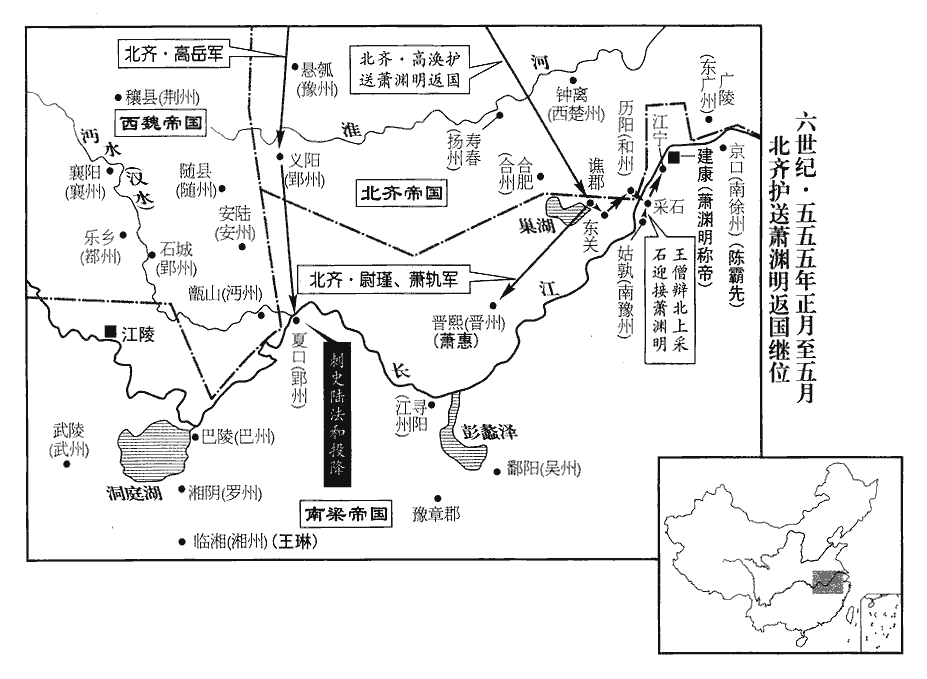4齊‹首都邺城河北省临漳县西南邺镇›主‹高洋,本年二十七岁›使清河王岳將兵攻魏安州‹府设安陆湖北省安陆市›,五代志:安陸郡,西魏置安州。以救江陵。岳至義陽‹北齐郢州州政府所在城·河南省信阳市›,江陵陷,因進軍臨江,郢州‹府设夏口湖北省武汉市›刺史陸法和及儀同三司宋蒞舉州降之;降,戶江翻。考異曰:北史「宋蒞」作「宋茝chǎi」。今從北齊紀。又北齊紀云:「壬寅,岳渡江,克夏首,送法和。」按典略,甲午,齊已召岳還。今從典略。長史江夏‹郡政府夏口›太守王珉不從,殺之。夏,戶雅翻。甲午‹十三›,齊召岳還,使儀同三司清都‹首都邺城›慕容儼戍郢州。北齊書,慕容儼,清都武安人,皝之後也。按魏收地形志,東魏都鄴,以魏郡置魏尹,武安縣屬焉。五代志:齊官有清都尹,蓋改魏尹為清都尹也。考異曰:梁紀:「四月,法和降齊,使侯瑱討之。」按齊主與王僧辯書云:「清河王岳今次漢口,與陸居士相會。」然則法和先已降齊也。今從典略。王僧辯遣江州‹府设寻阳江西省九江市›刺史侯瑱攻郢州,任約、徐世譜、宜豐侯循皆引兵會之。瑱,他甸翻,又音鎮。任,音壬。