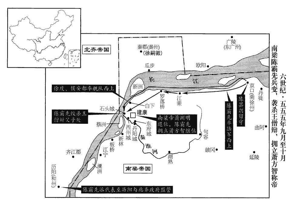 17王僧辯遣使奉啟於貞陽侯淵明,定君臣之禮,又遣別使奉表於齊,使,疏吏翻。以子顯及顯母劉氏、弟子世珍為質於淵明,質,音致。考異曰:典略:「三月,辛卯,遣廷尉張種等送質于鄴。」按淵明五月始入建康,疑太早,恐非。遣左民尚書周弘正至歷陽‹安徽省和县›奉迎,晉武帝太康中,置左民尚書。唐六典:曹魏置左民尚書,晉惠帝置右戶尚書。唐戶部尚書,即左民、右戶之任也。因求以晉安王為皇太子;淵明許之。淵明求度衛士三千,僧辯慮其為變,止受散卒千人。散,蘇旱翻。散卒者,冗散之卒,非敗散之卒也。敗散之散,去聲。庚子‹二十一›,遣龍舟法駕迎之,淵明與齊上黨王渙盟於江北,辛丑‹二十二›,自采石‹安徽省马鞍山市西南›濟江。考異曰:梁紀:「七月,辛丑,淵明濟江。甲辰,入京師。」北齊紀:「五月,蕭明入建業。」按典略,「五月,庚子,僧辯逆淵明;辛丑,濟江;癸卯,至建康。」今從之。於是梁輿南渡,齊師北返。僧辯疑齊,擁檝中流,檝jí,與楫同,櫂zhào也;所以撥水行船。擁檝,附船而不鼓,則船定而不進。不敢就西岸。齊侍中裴英起衛送淵明,與僧辯會于江寧‹江苏省江宁县西南江宁乡›。癸卯‹二十四›,淵明入建康,望朱雀門而哭,逆者以哭對。丙午‹二十七›,即皇帝位,改元天成,以晉安王‹萧方智›為皇太子,王僧辯為大司馬,陳霸先為侍中。