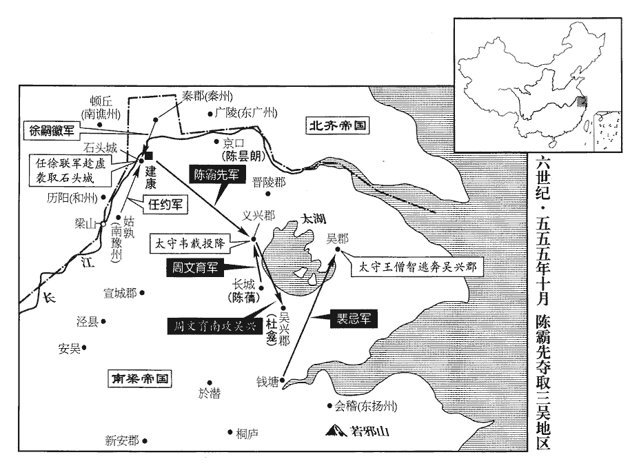 29杜龕恃王僧辯之勢,龕,苦含翻。素不禮於陳霸先,在吳興,每以法繩其宗族,霸先深怨之。及將圖僧辯,密使兄子蒨qiàn還長城‹浙江省长兴县›,長城縣,霸先與其宗族世居之。晉太康三年,分烏程立長城縣,屬吳興郡,今湖州長興縣是也,在湖州西北七十里。蒨,七見翻。立柵以備龕。僧辯死,龕據吳興拒霸先,義興‹江苏省宜兴市›太守韋載以郡應之。考異曰:典略作「韋載」。今從梁、陳書。今按典略,若作「韋載」,則與梁、陳書同,不須考異矣。吳郡太守王僧智,僧辯之弟也,亦據城拒守。考異曰:南史云,「僧智奔任約。」今從典略。陳蒨至長城,收兵纔數百人,杜龕遣其將杜泰將精兵五千奄至,將士相視失色。將,即亮翻;下同。蒨言笑自若,部分益明,分,扶問翻。眾心乃定。泰晝夜苦攻,數旬,不克而退。霸先使周文育攻義興,義興屬縣卒皆霸先舊兵,善用弩,韋載收得數十人,繫以長鎖,命所親監之,監,工銜翻。使射文育軍,約曰:「十射不兩中者死。」射,而亦翻。中,竹仲翻。故每發輒斃一人,文育軍稍卻。載因於城外據水立柵,相持數旬。杜龕遣其從弟北叟將兵拒戰,從,才用翻;下同。北叟敗,歸于義興。霸先聞文育軍不利,辛未‹二十四›,自表東討,留高州‹府设高凉广东省阳江市›刺史侯安都、石州‹府设永平广西藤县›刺史杜稜宿衛臺省。五代志:永平郡,梁置石州,隋後改曰藤州。宋白曰:藤州,治鐔xín津縣,漢猛陵縣也。甲戌‹二十七›,軍至義興,丙子‹二十九›,拔其水柵。