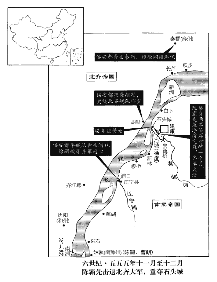 12五月,齊人召建安公淵明,詐許退師,考異曰:典略云:「五月,齊主在東山飲酒,投杯赫怒,召魏收於前,立為制書,欲自將西討長安,令上黨王渙將兵伐梁,於是渙南侵。」按梁、陳、北齊帝紀及渙傳皆無是事,今去之。陳霸先具舟送之。癸未‹九›,淵明疽發背卒。甲申‹十›,齊兵發蕪湖‹安徽省芜湖市›,庚寅‹十六›,入丹楊縣‹安徽省当涂县东北小丹阳›,此丹楊縣乃漢古縣,非今鎮江府之丹楊縣也。據沈約志,晉武帝太康三年,分丹楊縣立于湖縣。于湖,今太平州也。丹楊縣地當在太平州東北。丙申‹二十二›,至秣稜故治‹江苏省江宁县南秣陵乡›。沈約曰:秣陵本治去京邑六十里,今故治村是也。晉安帝義熙九年移治京邑,在鬬場。鬬場,猶今言教場。晉成帝咸和中,詔內外諸軍戲於南郊之場,因名戲場,亦曰鬬場。陳霸先遣周文育屯方山‹江宁县东南·秦淮河流经山下›,丹楊記,秦始皇鑿方山,其斷處為瀆,則今淮水。徐度頓馬牧‹江宁县西南秦淮河西畔›,馬牧,牧馬之地。杜稜頓大航‹朱雀桥›南以禦之。