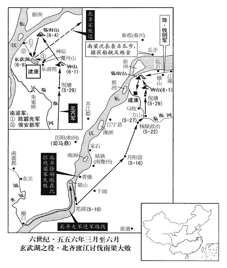 六月,甲辰‹一›,齊兵潛至鍾山‹建康城东›,侯安都與齊將王敬寶戰于龍尾,鍾山之龍尾也。自山趾築道陂陁pōtuó以登山,曰龍尾。軍主張纂戰死。丁未‹四›,齊師至幕府山,幕府山在今建康城西二十五里,晉琅邪王初渡江,丞相王導建幕府其上,因名。霸先遣別將錢明,將水軍出江乘‹江苏省南京市东北›,邀擊齊人糧運,盡獲其船米。齊軍乏食,殺馬驢食之。庚戌‹七›,齊軍踰鍾山,霸先與眾軍分頓樂遊苑東及覆舟山北‹覆舟山在玄武湖东南畔,乐游苑在覆舟山南麓›,斷其衝要。斷,音短。壬子‹九›,齊軍至玄武湖西北,將據北郊壇,晉成帝立北郊壇於覆舟山南。眾軍自覆舟東移頓壇北,與齊人相對。