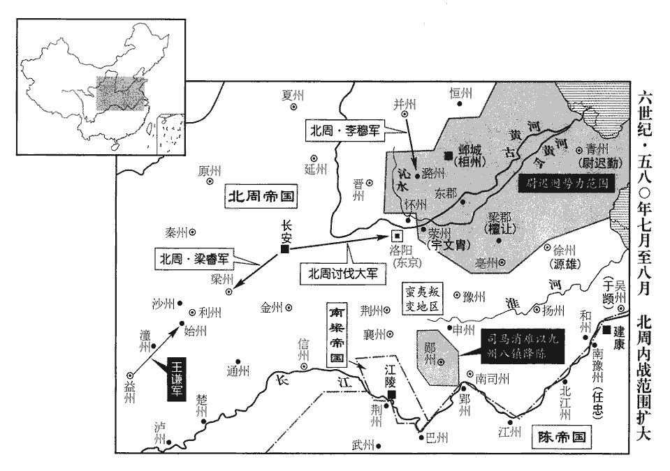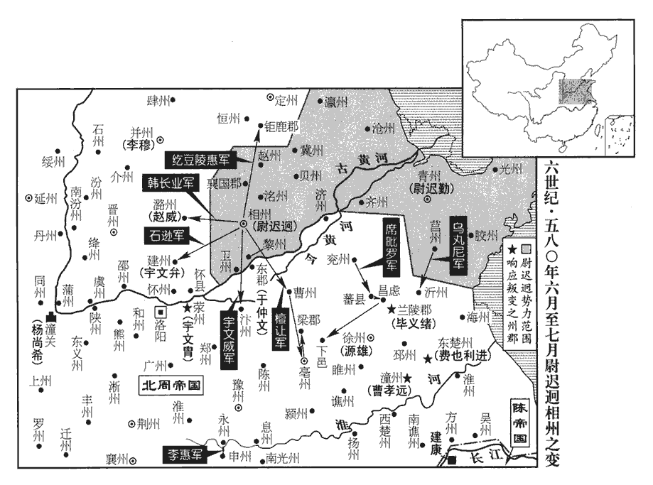 15周青州總管‹总部设东阳山东省青州市›尉遲勤,迥之弟子也。尉,紆勿翻。初得迥書,表送之,尋亦從迥。迥所統相、衛‹枋头城·河南省淇县东南淇门渡›、黎‹黎阳·河南省浚县›、洺‹广平·河北省永年县东南旧永年镇›、貝‹武成·河北省清河县西北›、趙‹广阿·河北省隆尧县›、冀‹信都·河北省冀州市›、瀛‹赵都军城·河北省河间市›、滄‹饶安·河北省盐山县西南›,五代志:汲郡,東魏置義州,後周為衛州。黎陽縣,後魏黎陽郡,後置黎州。武安郡,後周置洺州。清河郡,後周置貝州。趙郡大陸縣,舊曰廣阿,置殷州,後改趙州。信都郡,舊置冀州。河間郡河間縣,舊置瀛州。勃海郡饒安縣,舊置滄州。考異曰:周書迥傳又有毛州。按迥滅後,隋高祖始置毛州。迥傳誤也。勤所統青‹东阳·山东省青州市›、齊‹历城·山东省济南市›、膠‹东武·山东省诸城市›、光‹东莱·山东省莱州市›、莒‹团城·山东省沂水县›等州五代志:北海郡置青州。齊郡,舊曰齊州。高密郡,舊置膠州。東萊郡,舊置光州。琅邪郡沂水縣,舊置南青州,後周改為莒州。皆從之,眾數十萬。滎州‹虎牢·河南省荥阳市汜水镇西›刺史邵公冑,五代志:滎陽郡汜水縣,古虎牢也,後魏置東中府,東魏置北豫州,後周置滎州。邵公冑,周宗室也,封邵郡公。申州‹义阳·河南省信阳市›刺史李惠五代志:義陽郡,江左置司州,後魏改曰郢州,後周改曰申州。東楚州‹宿预·江苏省宿迁市›刺史費也利進,五代志:琅邪郡,後魏置南徐州,梁改為東徐州,東魏改東楚州,陳改安州,後周改泗州。豈史家以舊州名書之邪?費也,虜複姓,蓋即費也頭種。費,扶沸翻。潼州‹临潼·安徽省泗县›刺史曹孝遠,按五代志,後周亦無潼州,但云下邳郡夏丘縣,梁置潼州,後齊改曰睢州,尋廢。夏丘、宿豫,相去不遠,宿豫舊東楚治所,意此時尚有此二州而志逸之也。各據本州,徐州總管‹总部设彭城江苏省徐州市›司錄席毗羅據兗州‹瑕丘·山东省兖州市›,五代志:魯郡瑕丘縣,舊置兗州。姓苑:席姓,其先姓藉,避項羽諱,改姓席氏。前東平郡守畢義緒據蘭陵‹山东省枣庄市东南峄城镇›,五代志:蘭陵縣,舊曰承,置蘭陵郡。守,式又翻。皆應迥;懐縣‹河南省武涉县›永橋鎮將紇豆陵惠以城降迥。五代志:懷縣屬河內郡,隋大業初,廢入安昌縣。安昌本州縣。紇豆陵,虜三字姓。魏收官氏志:次南諸姓有紇豆陵氏。將,即亮翻。迥使其所署大將軍石遜攻建州‹高都·山西省晋城市›,建州刺史宇文弁以州降之。五代志:長平郡,舊曰建州。降,戶江翻。又遣西道行臺韓長業攻拔潞州‹上党·山西省长治市›,五代志:上黨郡,後周置潞州。執刺史趙威,署城人郭子勝為刺史。紇豆陵惠襲陷鉅鹿‹河北省藁城市›,鉅鹿,古郡也,隋為縣,屬襄國郡。遂圍恆州‹真定·河北省正定县›。五代志:恆山郡,後周置恆州。恆,戶登翻。上大將軍宇文威攻汴州‹大梁·河南省开封市›,五代志:滎陽郡浚儀縣,東魏置梁州,後周改曰汴州。汴,皮變翻。莒州刺史烏丸尼等帥青、齊之眾圍沂州‹琅邪·山东省临沂市›,五代志:琅邪郡,舊置北徐州,後周改曰沂州。帥,讀曰率。大將軍檀讓攻拔曹‹左城·山东省定陶县西›、亳‹谯城·安徽省毫州市›二州,五代志:濟陰郡,後魏置西兗州,後周改曰曹州。譙郡,後魏置南兗州,後周改亳州。亳,旁各翻。屯兵梁郡‹河南省商丘县›。梁郡治睢陽。席毗羅眾號八萬,軍於蕃城‹山东省滕州市›,攻陷昌慮‹滕州市东南›、下邑‹河南省夏邑县›。五代志:彭城郡滕縣,舊曰蕃,置蕃郡,隋改曰滕。昌慮,漢古縣,後魏屬蘭陵郡。下邑亦漢古縣,五代志屬梁郡。漢書:蕃,音皮;慮,音廬。李惠自申州攻永州‹楚王城·河南省信阳市北›,拔之。五代志:汝南郡城陽縣,梁置楚州,東魏置西楚州,後齊曰永州。城陽,前漢侯國,其地在義陽東北。