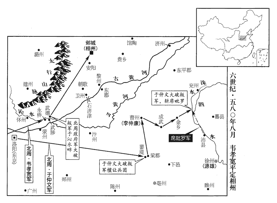 韋孝寬分兵討關東叛者,悉平之。堅徙相州於安陽‹河南省安阳市›,毀鄴城及邑居。劉昫曰:楊堅令韋孝寬討尉遲迥,平之,焚燒鄴城,徙其居人,南遷四十五里,以安陽城為相州理所,仍為鄴縣。隋又改為安陽縣。漢、魏郡城在縣西北七里,煬帝於鄴故都大慈寺置鄴縣。相,息亮翻。尉,紆勿翻。分相州,置毛州‹馆陶·河北省馆陶县›、魏州‹贵乡·河北省大名县›。五代志:武陽郡,後周置魏州,館陶縣置毛州。顏師古曰;漢武帝時,河北決於館陶,分為屯氏河。屯,音大門翻。而隨室分析州縣,誤以為毛氏河,乃置毛州,失之甚矣。