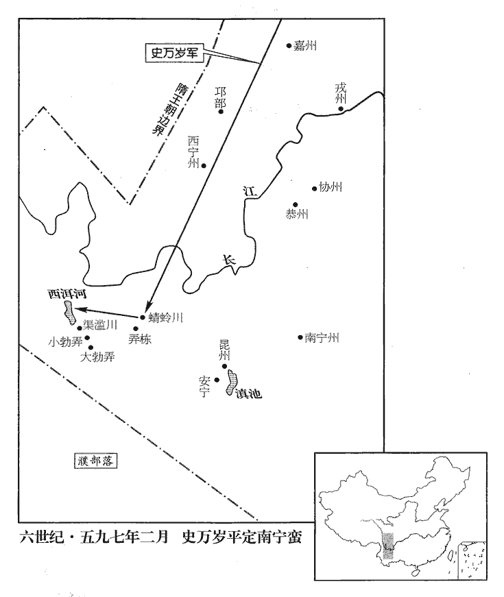 8南寧‹云南省曲靖市›夷爨翫復反。復,扶又翻。蜀王秀奏「史萬歲受賂縱賊,致生邊患。」上責萬歲,萬歲詆讕;讕lán,落干翻,又力誕翻。詆,拒諱也。讕,逸辭也。上怒,命斬之。高熲及左衛大將軍元旻等固請曰:「萬歲雄略過人,將士樂為致力,雖古名將,未能過也。」上意少解,於是除名為民。將,即亮翻。樂,音洛。少,詩沼翻。