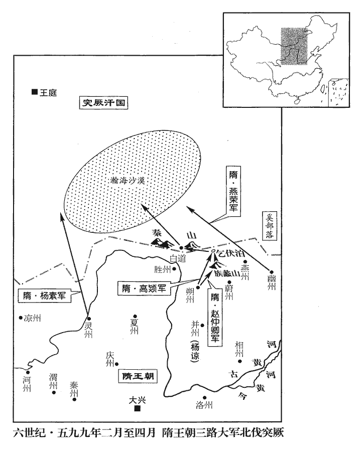 3突厥‹瀚海沙漠群›突利可汗因長孫晟奏言都藍可汗作攻具,欲攻大同城‹内蒙古乌拉特前旗›。唐志:自夏州北渡烏水,行五百三十餘里,過横水,又行百一十九里至安樂戍。戍在河西壖ruán,東壖有古大同城,今大同城,古永濟柵也。厥,九勿翻。可,從刊入聲。汗,音寒。長,知兩翻。晟,承正翻。詔以漢王諒為元帥,帥,所類翻。尚書左僕射高熲出朔州道‹山西省朔州市›,隋志:馬邑郡,舊置朔州。右僕射楊素出靈州道‹宁夏灵武市›,靈武郡,後魏置靈州。上柱國燕榮出幽州道‹北京市›以擊都藍,燕,因肩翻。皆取漢王‹杨谅,时驻并州山西省太原市›節度;然漢王竟不臨戎。