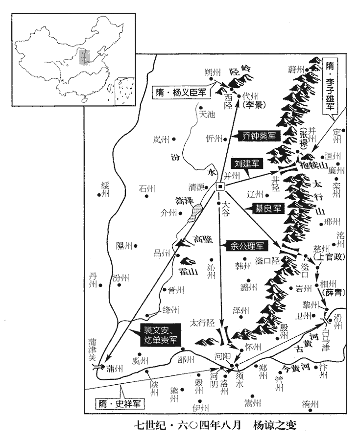 總管府兵曹聞喜‹山西省闻喜县›裴文安兵曹,兵曹參軍也。聞喜縣,屬絳州。說諒曰:「井陘‹河北省井陉县西›以西,在王掌握之內,山‹太行山›東士馬,亦為我有,宜悉發之;分遣羸兵屯守要害,仍命隨方略地,帥其精銳,直入蒲津‹山西省永济市西黄河渡口›。同州朝邑縣有蒲津關,渡河,東即蒲州城。陘,音刑。羸,倫為翻。帥,讀曰率。文安請為前鋒,王以大軍繼後,風行雷擊,頓於霸上‹陕西省西安市东灞河畔›。自武關入,則頓於霸上,自蒲津入,豈須頓於霸上!蓋欲乘高以臨長安耳。咸陽‹陕西省咸阳市›以東,可指麾而定。京師震擾,兵不暇集,上下相疑,群情離駭;我陳兵號令,誰敢不從!旬日之間,事可定矣。」考異曰:大業略記云:「司兵參軍裴文安說諒曰:『今梓宮尚在仁壽宮,比其徵兵,動移旬月。今若簡驍勇萬騎,令文安督領,不淹十五日,徑據長安,其在京被黜停私之徙,並擢授高位,付以心膂,共守京城,則咸陽以東府縣非彼之有。然後大王總兵鼓行而西,聲勢一接,天下可指揮而定也。』諒不從。」大業雜記云:「文安又說曰:『先人有奪人之心,殿下選精騎一萬,徑往京師奔喪,曉夜兼行,誰敢止約!至京徑掩仁壽宮,彼縱徵召,未暇禦我,大軍駱驛隨王而至,此則次計。王直資河北,彼率天下之兵,百道攻我,則難為主人,此下計也。』」今從隋書。諒大悅,於是遣所署大將軍余公理出太谷‹山西省太谷县›,趣河陽‹河南省孟州市›,姓苑:余姓,由余之後。隋志:太谷縣,屬太原郡,舊曰陽邑,開皇十八年改焉。水經註:太谷,谷名,在祁縣東南。河陽縣屬懷州,欲由此渡孟津。趣,七喻翻;下同。大將軍綦良出滏口‹河北省武安市西南›,趣黎陽‹河南省浚县›,綦,姓也。此二軍皆欲使渡河,略河南。滏fǔ,音釜。大將軍劉建出井陘‹河北省井陉县西›,略燕、趙,陘,音刑。柱國喬鍾葵出鴈門‹代州·山西省代县›,鴈門郡,代州也。時李景以代州拒諒,使鍾葵自嵐州攻之。署文安為柱國,與柱國紇單貴、王聃等直指京師。紇單,虜複姓。紇,下沒翻。單,多寒翻,又達演翻。聃,他酣翻。