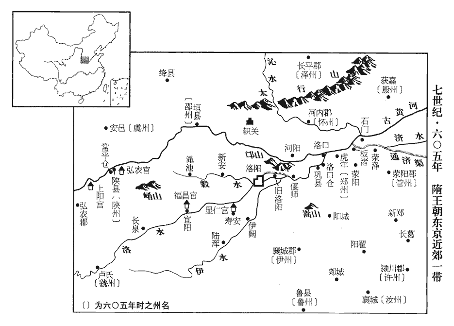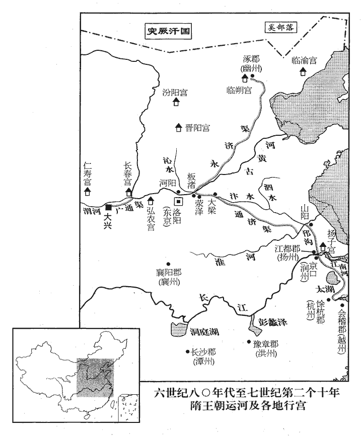 10敕宇文愷與內史舍人封德彝等營顯仁宮‹河南省宜阳县东南›,南接皁澗‹洛水支流›,北跨洛濱。隋志:河南郡壽安縣有顯仁宮。水經註:洛水徑宜陽縣故城南,又東與黑澗水合,水出陸渾西山,歷黑澗西北入洛。皁,才早翻。發大江之南、五嶺‹南岭›以北奇材異石,輸之洛陽;又求海內嘉木異草,珍禽奇獸,以實園苑。辛亥‹二十一›,命尚書右丞皇甫議發河‹黄河›南、淮‹淮河›北諸郡民,前後百餘萬,開通濟渠。杜佑曰:陳留郡城西有通濟渠,煬帝開以通江、淮漕運,兼引汴水,即蒗làng蕩渠也。考異曰:雜記作「皇甫公儀」,又云,「發兵夫五十餘萬。」今從略記。自西苑引穀、洛水達于河;是歲營建東京,東去故都十八里,南直伊闕之口,北倚邙山之塞,東出瀍水之東,西出澗水之西;其城西面連苑,距上陽宮七里。苑牆周廻一百二十六里,北拒北邙,西至孝水,南帶洛水支渠,穀、洛二水會于其間,故自苑引之為渠,以達于河。復自板渚‹河南省荥阳市北›引河歷滎澤‹河南省郑州市西北›入汴;板渚在虎牢之東。水經:河水東合汜水,又東過板城,北有津謂之板城渚口。又東過滎陽縣,蒗蕩渠出焉。是渠南出為汴水,漢之滎陽石門即其地也。隋志:滎陽郡滎澤縣,開皇四年置,曰廣武,仁壽元年改焉。又自大梁‹河南省开封市›之東引汴水入泗,達于淮;大梁,即浚儀也。引河入汴,汴入泗,蓋皆故道。又發淮南民十餘萬開邗hán溝,自山陽‹江苏省淮安市›至楊子‹江苏省扬州市南长江渡口›入江。春秋吳城邗溝通江淮,此亦因故道也。邗溝,貫今揚州城中。山陽,今淮安州。楊子,今真州。邗,音寒。渠廣四十步,廣,古曠翻。渠旁皆築御道,樹以柳;自長安至江都‹江苏省扬州市›,江都郡,揚州。置離宮四十餘所。庚申‹三十›,遣黃門侍郎王弘等往江南造龍舟及雜船數萬艘。艘,蘇遭翻。東京官吏督役嚴急,役丁死者什四五,所司以車載死丁,東至城皋‹河南省荥阳市汜水镇西›,隋志:鄭州滎陽縣舊置成皋郡。北至河陽‹河南省孟州市›,相望於道。又作天經宮於東京,四時祭高祖‹杨坚›。經曰:夫孝,天之經也。故以名宮。