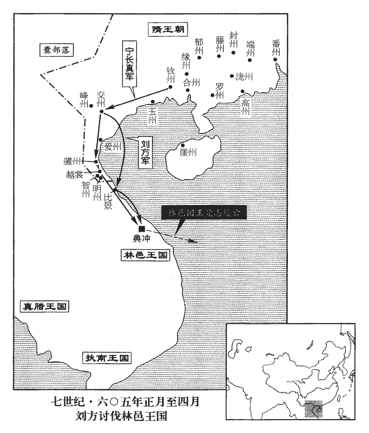 5高祖‹杨坚›之末,群臣有言林邑‹越南中部›多奇寶者。時天下無事,劉方新平交州‹越南河内市东北北宁府›,劉方平交州見上卷仁壽三年。乃授方驩州道‹越南荣市›行軍總管,隋志:日南郡,梁置德州,開皇十八年,改曰驩州。經略林邑。方遣欽州‹广西钦州市›刺史寧長真等以步騎萬餘出越裳‹越南甘禄县›,隋志:寧越郡,置欽州。越裳縣屬日南郡。方親帥大將軍張愻xùn等以舟師出比景‹越南筝河口›,比景,漢縣,屬日南郡,隋置比景郡。帥,讀曰率。愻,蘇困翻。是月,軍至海口。林邑出海之口。