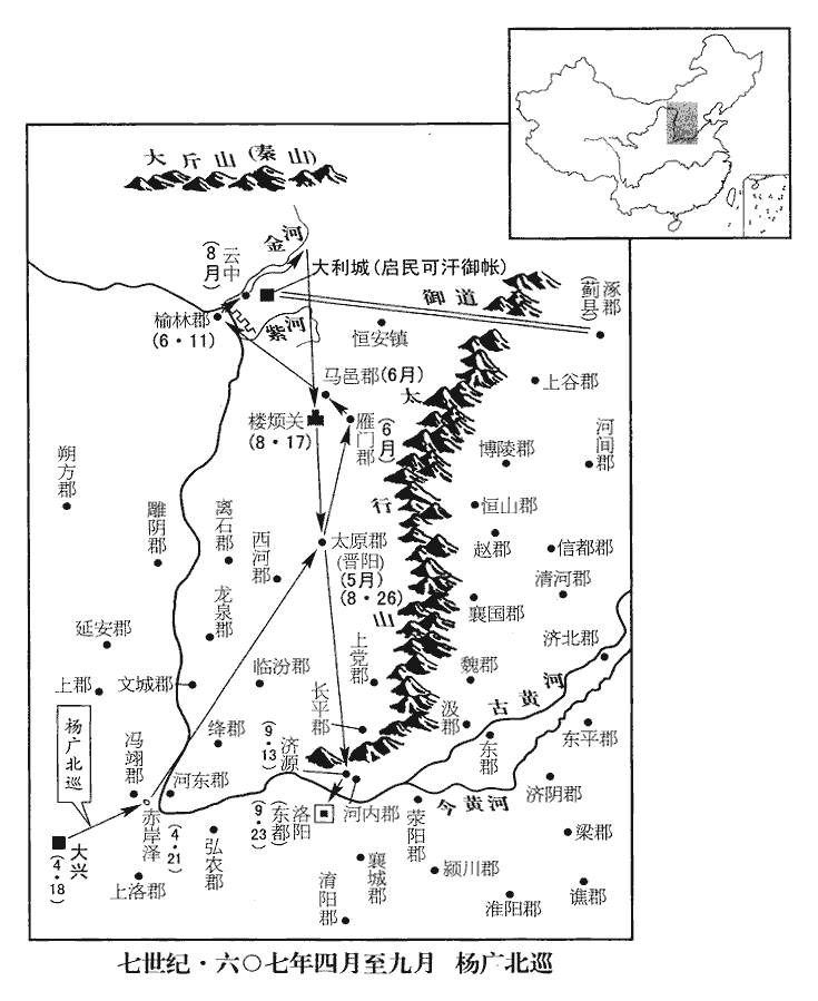 8丙寅‹十八›,車駕北巡;己亥‹二十一›,頓赤岸澤‹陕西省大荔县西南›。五月,丁巳‹九›,【章:十二行本「巳」作「酉」;乙十一行本同;孔本同。】突厥‹瀚海沙漠群›啟民可汗遣其子拓特勒來朝。厥,九勿翻。可,從刊入聲。汗,音寒。朝,直遙翻。戊午‹十›,發河‹黄河›北十餘郡丁男鑿太行山,達于并州‹山西省太原市›,以通馳道。行,戶剛翻。丙寅‹十八›,啟民遣其兄子毗黎伽特勒來朝。伽,求加翻。辛未‹二十三›,啟民遣使請自入塞奉迎輿駕,使,疏吏翻。上不許。