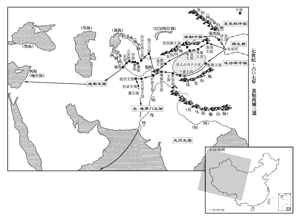 14西域諸胡多至張掖‹甘肃省张掖市›交市,帝改甘州為張掖郡。交市,為互市也。帝使吏部侍郎裴矩掌之。矩知帝好遠略,商胡至者,矩誘訪諸國山川風俗,王及庶人儀形服飾,撰西域圖記三卷,合四十四國,入朝奏之。好,呼報翻。誘,音酉。撰,士免翻。朝,直遙翻;下同。仍別造地圖,窮其要害,從西傾‹甘肃省玛曲县›以去,西傾山,在隴西臨洮縣西南,洮水之所出也。縱橫所亘,將二萬里,發自敦煌‹甘肃省敦煌市›,帝改瓜州為敦煌郡。敦,徒門翻。至于西海‹地中海›,此西海在條支西。凡為三道,北道從伊吾‹北道自伊吾新疆哈密市›,经蒲类海新疆巴里坤哈萨克自治县西北巴里坤湖铁勒汗国新疆天山山脉一带,至西突厥汗国王庭三弥山·新疆拜城县东北,渡过北流河水今地不详,至拂菻罗马帝国,到达西海地中海。自西突厥王庭之后,路线不详,中道從高昌‹中道从高昌新疆吐鲁番市东›,经焉耆新疆焉耆县、龟兹新疆库车县、疏勒新疆喀什市,越过葱岭帕米尔高原,再经钹汗乌兹别克斯坦卡散赛城、苏对沙那乌兹别克斯坦列宁纳巴德市西南乌拉秋别城、康国乌兹别克斯坦撒马尔罕市、曹国乌兹别克斯坦撒马尔罕市西北伊什特汗城、何国伊什特汗城西、安国乌兹别克斯坦布哈拉市、小安国布哈拉市东北、穆国乌兹别克斯坦查尔朱城、波斯伊朗,到达西海地中海,南道從鄯善‹南道从鄯善新疆若羌县›、经于阐新疆和田市、朱俱波新疆叶城县、喝槃陀新疆塔什库尔干塔吉克自治县,越过葱岭,又经过护密中亚塔吉克霍罗格城南、吐火罗阿富汗北部汗阿巴德城、挹怛阿富汗北部马扎里沙里夫城、忛延阿富汗巴米安城、漕阿富汗吉兹尼市,至北婆罗门巴基斯坦,到达西海地中海。此应是海路,路线不详,伊吾,唐為伊州。高昌,唐為西州。鄯善,唐為納縛波地。鄯,時戰翻。總湊敦煌。且云:「以國家威德,將士驍雄,將,即亮翻。驍,堅堯翻。汎濛汜而越崑崙,易如反掌。濛汜,蒙谷之水也,日所入處。史記禹本紀言河出崑崙。汜,祥里翻。崑,盧昆翻。易,以豉翻。但突厥‹新疆北部及中亚东部›、吐渾‹青海省›分領羌、胡之國,為其壅遏,故朝貢不通。吐,從暾入聲。朝,直遥翻。今並因商人密送誠款,引領翹首,願為臣妾。若服而撫之,務存安輯,皇華遣使,弗動兵車,諸蕃既從,渾、厥可滅,混壹戎、夏,其在茲乎!」渾、厥,謂吐谷渾、突厥也。使,疏吏翻。厥,九勿翻。夏,戶雅翻。帝大悅,賜帛五百段,日引矩至御坐,親問西域事。矩盛言「胡中多諸珍寶,吐谷渾易可并吞。」谷,音浴。易,戈豉翻。帝於是慨然慕秦皇、漢武之功,甘心將通西域;四夷經略,咸以委之。以矩為黃門侍郎,復使至張掖,引致諸胡,啗之以利,勸令入朝。復,扶又翻。啗,徒濫翻,又徒覽翻。自是西域胡往來相繼,所經郡縣,疲於送迎,糜費以萬萬計,卒令中國疲弊以至於亡,卒,子恤翻。皆矩之唱導也。