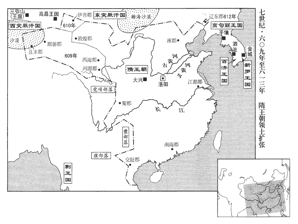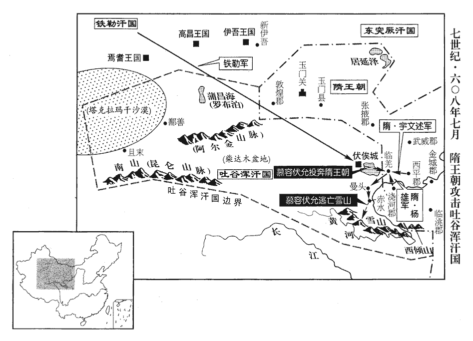 11裴矩說鐵勒‹新疆东北部及蒙古国北部›,說,式芮翻。使擊吐谷渾‹青海省›,大破之。吐谷渾可汗伏允東走,入西平‹青海省乐都县›境內,帝改鄯州為西平郡。吐,讀暾入聲。谷,音浴。可,從刊入聲。汗,音寒。遣使請降求救;帝遣安德王雄出澆河‹青海省贵德县›,前已書觀王雄,此復書安德王雄何也?按雄傳,雄從帝征吐谷渾還,方徙封觀王,高熲誅之時,雄尚為安德王,通鑑因舊史成文而書之耳。帝改廓州為澆河郡。使,疏吏翻。降,戶江翻。澆,古堯翻。許公宇文述出西平迎之。宇文述封許國公。述至臨羌城‹青海省湟源县›,漢臨羌縣城也。吐谷渾畏述兵盛,不敢降,帥眾西遁;帥,讀曰率。述引兵追之,拔曼頭‹青海省共和县西南›、赤水‹青海省兴海县›二城,隋志:帝平吐谷渾,置河源郡於古赤水城,管下有曼頭城。曼,音萬。斬三千餘級,獲其王公以下二百人,虜男女四千口而還。還,從宣翻,又如字;下同。伏允南奔雪山‹积石山·青海省东南部阿尼玛卿山›,此即蜀西山之西雪山也。其故地皆空,東西四千里,南北二千里,皆為隋有,置州、【章:十二行本「州」作「郡」;乙十一行本同;孔本同。】縣、鎮、戍,置鄯善‹新疆若羌县›、且末‹新疆且末县›、西海‹青海省海晏县›、河源‹青海省兴海县›四郡,顯武、濟遠、肅寧、伏戎、宣德、威定、遠化、赤水等縣。志云,置於五年。天下輕罪徙居之。