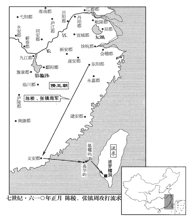 3帝復遣朱寬招撫流求‹台湾岛›,復,扶又翻。流求不從,帝遣虎賁郎將廬江‹安徽省合肥市›陳稜、朝請大夫同安‹安徽省潜山县›張鎮周發東陽‹浙江省金华市›兵萬餘人,自義安‹广东省潮州市›汎海擊之。賁,音奔。將,即亮翻。帝改廬州為廬江郡,熙州為同安郡,婺州為東陽郡,潮州為義安郡。行月餘,至其國,以鎮周為先鋒。流求王渴剌兜剌,盧達翻。遣兵逆戰;屢破之,遂至其都‹婆罗檀洞·台湾省屏东县恒春半岛境›。流求國王所居曰婆羅檀洞,塹柵三重,環以流水,樹棘為藩。渴剌兜自將出戰,將,即亮翻。又敗,退入柵;稜等乘勝攻拔之,斬渴剌兜,虜其民萬餘口而還。還,從宣翻,又如字。二月,乙巳‹十三›,稜等獻流求俘,頒賜百官,進稜位右光祿大夫,鎮周金紫光祿大夫。