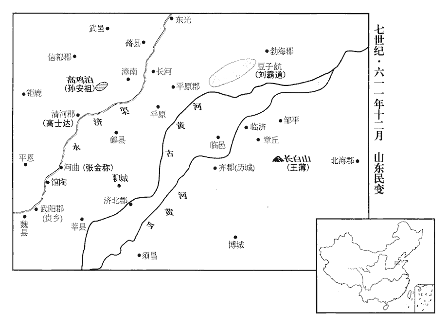 漳南‹河北省故城县东›人竇建德,漳南,本漢東陽縣地,久廢,開皇六年復置,十八年改為漳南,屬清河郡。宋白曰:取地居漳水之南為名。少尚氣俠,膽力過人,為鄉黨所歸附。會募人征高麗,建德以勇敢選為二百人長。少,詩照翻。長,知兩翻。同縣孫安祖亦以驍勇選為征士,驍,堅堯翻。安祖辭以家為水所漂,妻子餒死,縣令怒笞之。安祖刺殺令,刺,七亦翻。亡抵建德,考異曰:杜儒童隋季革命記云,「安祖以盜羊為縣令所考」,今從舊唐書建德傳。建德匿之。官司逐捕,蹤跡至建德家,建德謂安祖曰:「文皇帝‹杨坚›時,天下殷盛,發百萬之眾以伐高麗,尚為所敗。即謂開皇十八年事。敗,補邁翻。今水潦為災,百姓困窮,加之往歲西征,謂西征吐谷渾。行者不歸,瘡痍未復;主上‹杨广›不恤,乃更發兵親擊高麗,天下必大亂。丈夫不死,當立大功,豈可但為亡虜邪!」邪,音耶。乃集無賴少年,得數百人,使安祖將之,少,詩照翻。將,即亮翻。入高雞泊‹河北省故城县西›中為群盜,新唐書曰:高雞泊廣袤數百里,葭薍wàn阻奧,可以違難。安祖自號將軍。時鄃shū‹山东省夏津县›人張金稱聚眾河曲‹永济运河弯曲处·应在河北省临西县一带›,鄃,漢縣,舊廢,開皇十六年復置,屬清河郡。河曲,清河之曲,新唐書作「河渚」。鄃,音輸。蓨tiáo‹河北省景县›人高士達聚眾於清河‹河北省清河县›境內為盜。蓨,舊曰脩,開皇五年改屬信都郡。蓨,音條。郡縣疑建德與賊通,悉收其家屬,殺之。新書曰:時群盜往來漳南,剽殺人,焚鄉聚,獨不入建德閭,由是郡縣疑其與賊通。建德帥麾下二百人亡歸士達,帥,讀曰率。士達自稱東海公,以建德為司兵。頃之,孫安祖為張金稱所殺,其眾盡歸建德,兵至萬餘人。建德能傾身接物,與士卒均勞逸,由是人爭附之,為之致死。為,于偽翻。竇建德始此。