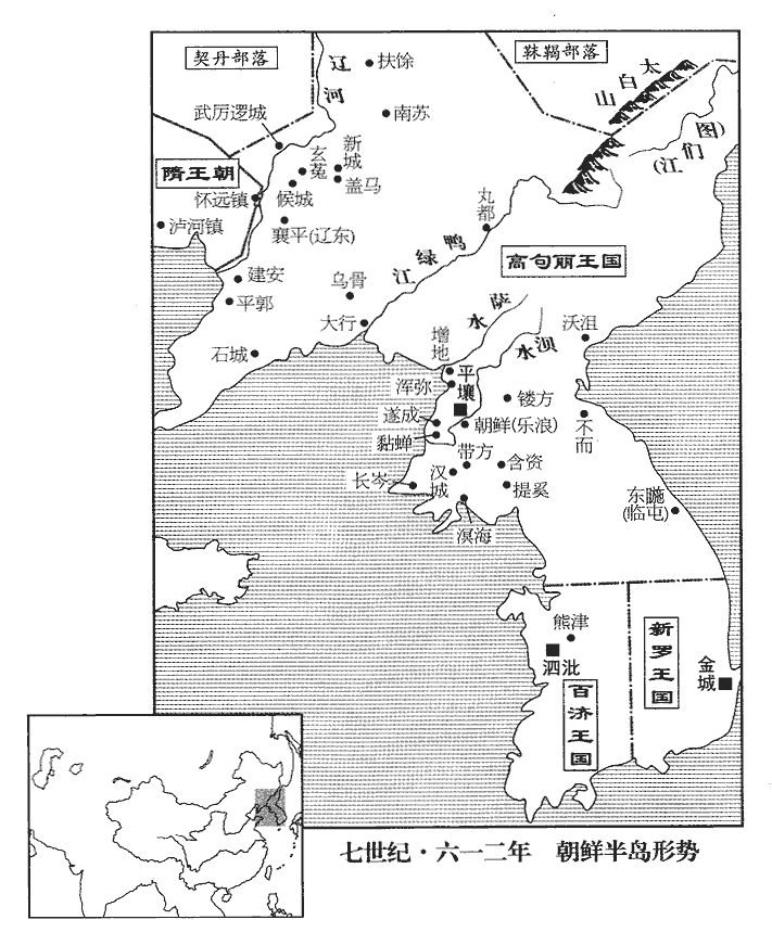 壬午‹二›,詔左十二軍出鏤方‹朝鲜半岛成川城›、長岑‹朝鲜半岛长渊城›、溟海‹朝鲜半岛海州›、蓋馬‹辽宁省抚顺市›、建安‹辽宁省盖州市›、南蘇‹辽宁省西丰县南›、遼東‹辽宁省辽阳市›、玄菟‹辽宁省沈阳市›、扶餘‹吉林省四平市›、朝鮮‹朝鲜平壤市南›、沃沮‹朝鲜半岛咸兴市›、樂浪‹朝鲜·朝鲜平壤市南›等道,帝指授諸軍所出之道,多用漢縣舊名。漢志:鏤方、長岑、朝鮮,屬樂浪郡。蓋馬,屬玄菟郡,有蓋馬大山。遼東,漢郡名。溟海,蓋即漢樂浪郡之海冥縣。建安、南蘇、扶餘,皆高麗國城守之處。沃沮,亦古地名,是時其地已入新羅界。鏤,郎豆翻。菟,音塗。朝,音潮。鮮,音仙。沮,子餘翻。樂,音洛。浪,音郎。右十二軍出黏蟬‹朝鲜半岛龙岗城›、含資‹朝鲜半岛瑞兴城›、渾彌‹朝鲜半岛平原城›、臨屯‹朝鲜半岛江陵市›、候城‹辽宁省沈阳市西南›、提奚‹朝鲜半岛金川城›、蹋頓‹今地不详›、肅慎‹黑龙江下游›、碣石‹朝鲜平壤市北›、東暆yí‹临屯·朝鲜半岛江陵市›、帶方‹朝鲜半岛沙里院城›、襄平‹辽东·辽宁省辽阳市›等道,漢志:黏蟬、含資、渾彌、提奚、東暆、帶方等縣,屬樂浪郡。候城、襄平,屬遼東郡。臨屯,亦漢武帝所置郡名。蹋頓,即漢末遼西烏丸蹋頓所居。肅慎,古肅慎氏之國,其地時為靺鞨所居。碣石,禹貢之碣石也。杜佑以為此碣石在高麗中。佑曰:碣石山,在漢樂浪郡遂城縣,秦長城起於此山。今驗長城東截遼水而入高麗,遺址猶存。黏,女廉翻。蟬,服虔音提。蹋,徒盍翻。碣,其列翻。暆,應劭曰,音移。駱驛引途,駱驛,相繼不絕也。總集平壤,平壤城,高麗國都也,亦曰長安城,東西六里,隨山屈曲,南臨浿pèi水‹朝鲜清川江和大同江的古称›。杜佑曰:高麗王自東晉以後居平壤城,即漢樂浪郡王險城。凡一百一十三萬三千八百人,號二百萬,其餽運者倍之。宜社於南桑乾水上,類上帝於臨朔宮南,記王制:天子將出,類乎上帝,宜乎社。鄭氏註:類、宜,皆祭名。孔穎達曰:天道遠,以事類而祭告之也。社主殺戮,故求便宜。社主陰,萬物於此斷殺,故曰宜。桑乾河,逕薊城南。水經:濕水出鴈門陰館縣,東北過代郡桑乾縣,謂之桑乾水,東過廣陽薊縣北。今在薊城南,城邑有變遷也。乾,音干。祭馬祖於薊城北。周禮祭馬祖,鄭氏註曰:馬祖,天駟也。帝親授節度:每軍大將、亞將各一人;騎兵四十隊,隊百人,十隊為團,步卒八十隊,分為四團,團各有偏將一人;其鎧冑、纓拂、旗旛,每團異色;將,即亮翻。騎,奇寄翻。鎧,可亥翻。受降使者一人,承詔慰撫,不受大將節制;其輜重散兵等亦為四團,降,戶江翻。使,疏吏翻。重,直用翻。散,悉但翻。使步卒挾之而行;進止立營,皆有次敘儀法。癸未‹三›,第一軍發;日遣一軍,相去四十里,連營漸進,終四十日,發乃盡,首尾相繼,鼓角相聞,旌旗亘九百六十里。御營內合十二衛、三臺、五省、九寺,分隸內、外、前、後、左、右六軍,次後發,又亘八十里。近古出師之盛,未之有也。