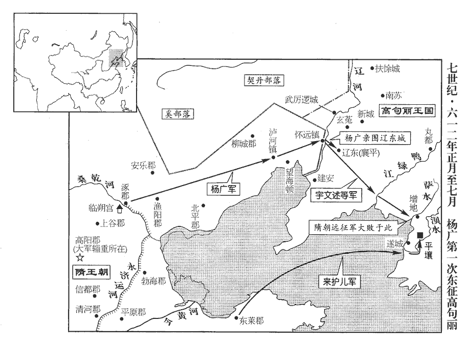 〖译文〗 [9]诸位将领将向东进军时,炀帝亲自告诫说:“今天我们吊民伐罪,不是为了功名。诸将若是有人不理解朕的意图,想以轻兵掩袭,孤军独斗,建立自身的功名以邀赏请封,这不符合大军征行之法。你们进军应当分为三路,有攻战之事,一定要三路人马互相配合,不许轻军独进,以致失利败亡。还有,凡是军事上的进止,都须奏报,等待命令,不许擅自行事。”辽东高丽军几次出战不利,于是就闭城固守。炀帝命令各军攻城,同时又命令诸将,高丽人若请求投降,立即就宣布安抚接纳,不得纵兵进攻。辽东城将要攻陷时,城中高丽人就声称要投降,将领们奉炀帝旨意,不敢抓住这一时机,先命人飞马奏报炀帝,等到答复回来,城中的防守已调整巩固好了,随即高丽军又坚守城池。崐如此再三,炀帝仍是不醒悟。因而城池久攻不下。六月,己未(十一日),炀帝来到辽东城南,观看辽东城的形势,他把将领们召集起来斥责说:“你们自以为官居高位,又依恃着家世显赫,想要暗中怠慢欺骗朕吗?在京师的时候,你们都不愿意让我来,恐怕我看见你们的私弊和腐败。今天我到这里来,正是要观察你们的所作所为,要杀你们这些人!今天你们怕死,不肯尽力,以为我不能杀你们吗?”诸将都惊惧、战栗而变了脸色。炀帝因此就留在辽东城西几里外的地方,住在六合城。高丽的城池都各自坚守,未能攻下。右翊卫大将军来护儿率领江、淮水军,船只连绵几百里,渡海先行,从水进入高丽。距平壤六十里时,与高丽军相遇,隋水军进攻,大破高丽军。来护儿想乘胜进取平壤,副总管周法尚阻止他,请他等待各路军队到达后,一同进攻。来护儿不听,他挑选精锐甲士四万人,直趋城下。高丽人在罗郭内空寺中设下伏兵,先出兵与来护儿交战,然后佯装战败,来护儿率兵追入城内,他纵兵俘获抢掠,队伍乱不成伍,这时高丽的伏兵出击,来护儿大败,仅只身逃出,士卒生还的不过几千人。高丽军追杀到隋军的船只停泊处,周法尚严阵以待,高丽军才退。来护儿率军返回,屯兵于海边,不敢再留下接应各路军队。