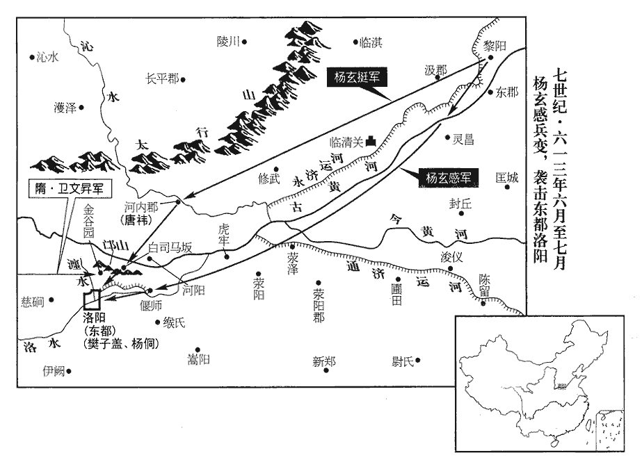 禕又使人告東都越王侗與樊子蓋等勒兵為備,果如李密所料。侗,他紅翻。脩武‹河南省修武县›民相帥守臨清關‹河南省新乡市东北›。脩武縣屬河內郡。玄感不得度,乃於汲郡南渡河,從之者如市。使弟積善將兵三千,自偃師‹河南省偃师县›南緣洛水西入,隋志:偃師縣舊廢,開皇十六年復置,屬河南郡。玄挺自白司馬坂‹洛阳城北›逾邙山南入,白司馬坂在邙山北,邙山在洛城北。坂,音反。玄感將三千餘人隨其後,相去十里許,自稱大軍。其兵皆執單刀柳楯,楯,食尹翻,干也,以扞弓矢。無弓矢甲冑。東都遣河南令達奚善意隋志:河南縣,帶河南郡。將精兵五千人拒積善,將作監、河南贊治裴弘策將八千人拒玄挺。治,直吏翻。善意渡洛南,營於漢王寺;明日,積善兵至,不戰自潰,鎧仗皆為積善所取。弘策出至白司馬坂,一戰,敗走,棄鎧仗者太半,鎧,可亥翻。玄挺亦不追。弘策退三四里,收散兵,復結陳以待之;復,扶又翻。陳,讀曰陣。玄挺徐至,坐息良久,忽起擊之,弘策又敗,如是五戰。丙辰‹十四›,玄挺直抵太陽門,弘策將十餘騎馳入宮城,自餘無一人返者,皆歸於玄感。